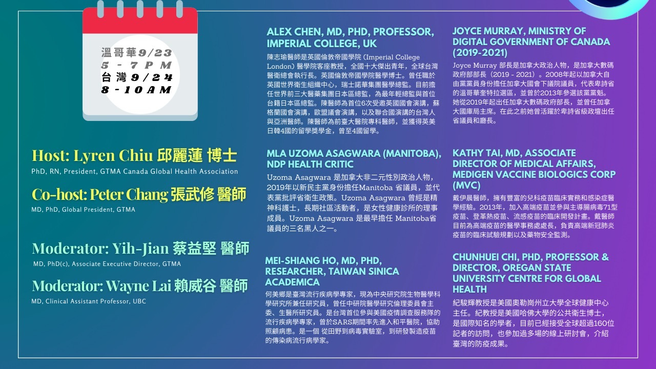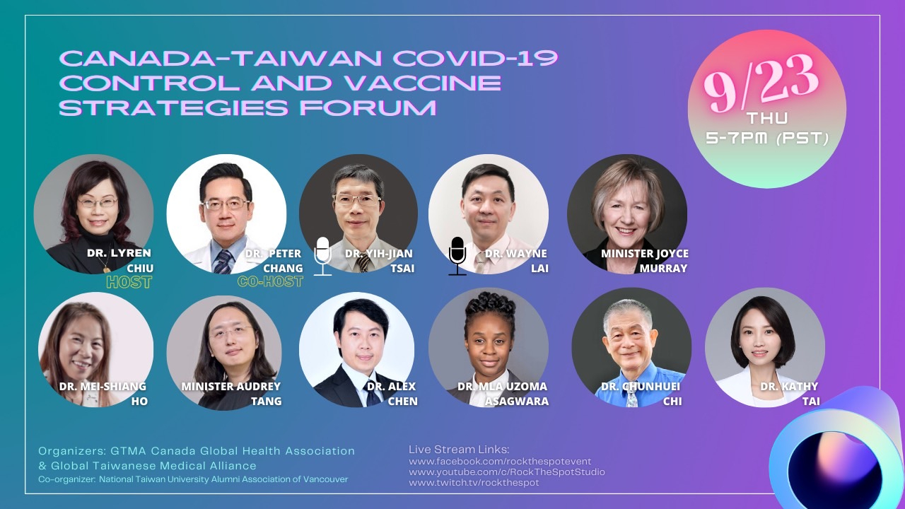 加拿大GTMA全球衛生協會於9月23日舉辦台加COVID-19 防疫與疫苗發展策略論壇。本論壇將結合加台兩地疫苗發展專家、學者、以及決策者等,以提供加台民眾有關防疫與疫苗發展策略的洞見,強調新冠病毒疫苗生物科技各方面的努力,探討疫苗護照等防疫策略,以及加台之間在防疫方面的合作。