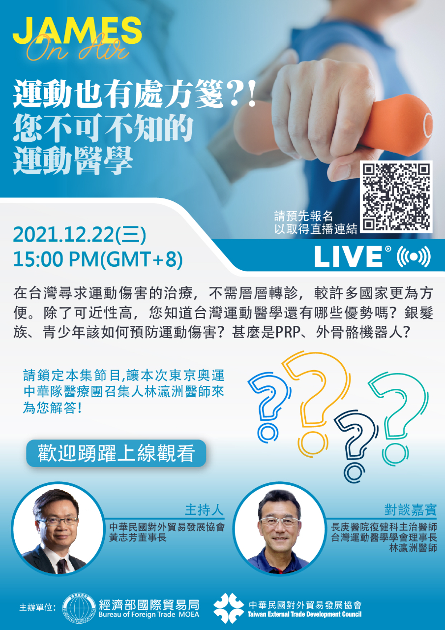 外貿協會「健康產業系列座談會」第四場「運動也有處方箋?!您不可不知的運動醫學」線上座談加西時間12月21日(二)晚間11時開播