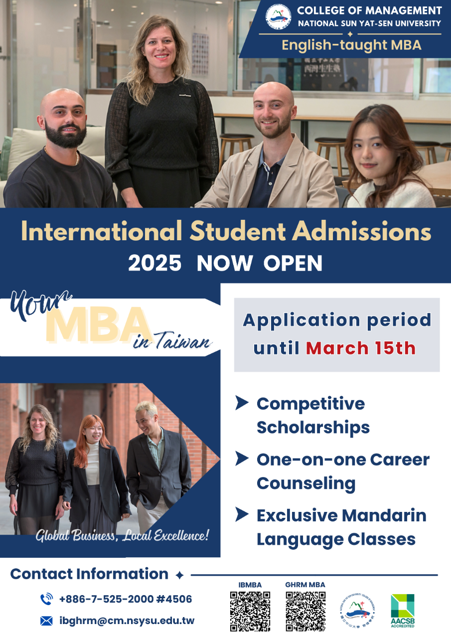 國立中山大學管理學院國際經營管理權英語學士學位課程(IBBA)擬招收10名外籍生;國際經營管理碩士學程(IBMBA)及人力資源管理全英語碩士學位學程(GHEM MBA)擬招收共45名外籍生。