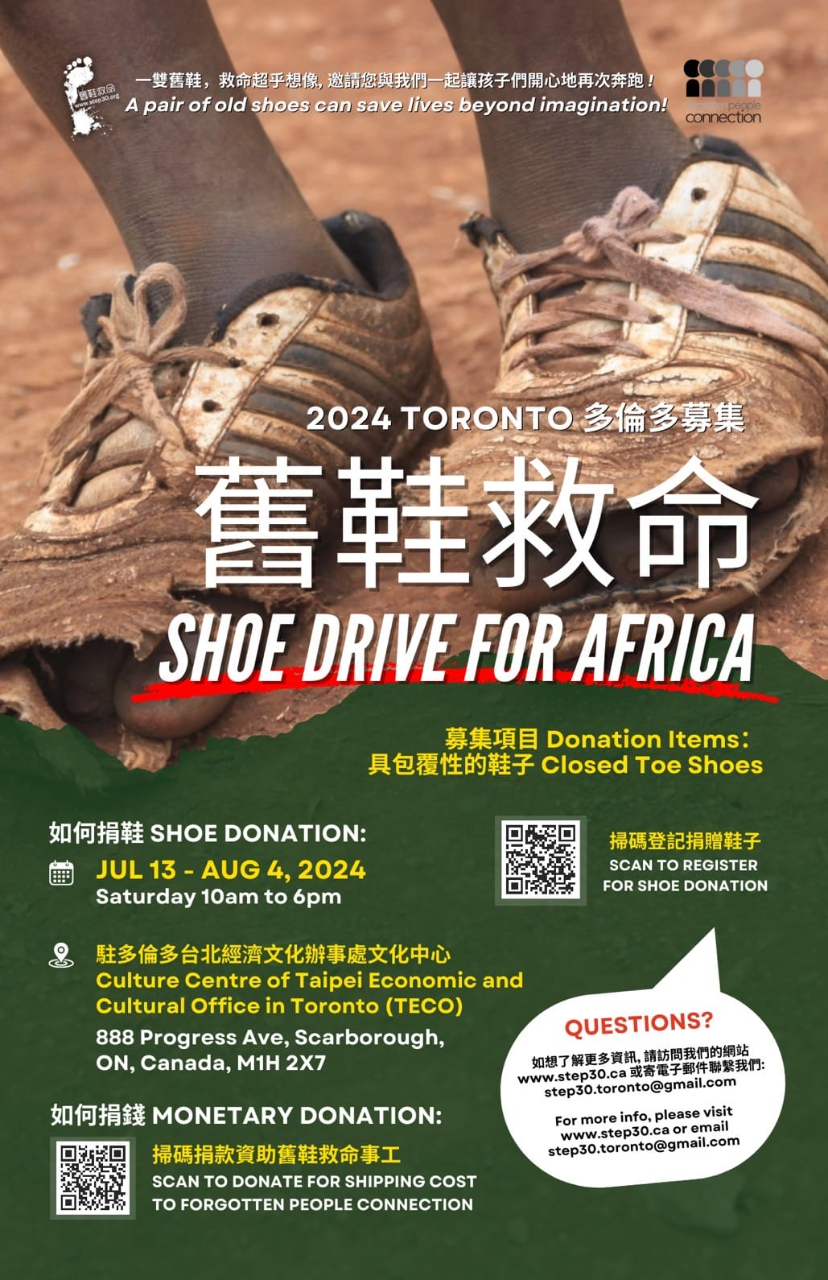 舊鞋救命第一次來到多倫多募集鞋子,希望募集到3萬雙鞋子,在八月上貨櫃遇到東非,每雙鞋子運費成本2加元,一點的愛心積少成多,就能幫助到非洲的孩童~