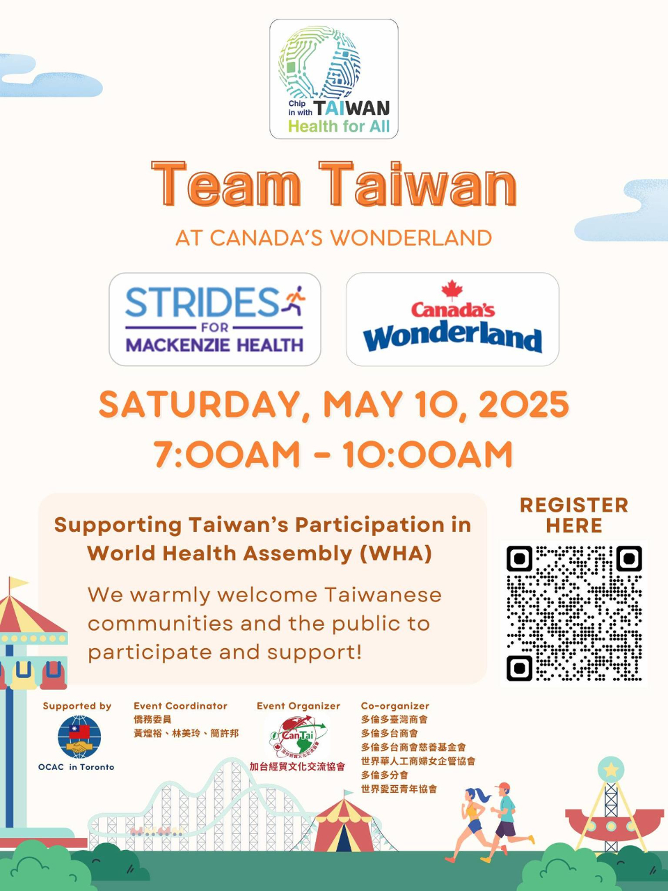歡迎加入台灣社區將攜手參加2025的 Strides for Mackenzie Health 健走慈善活動,並以實際行動支持 WHA for Taiwan!