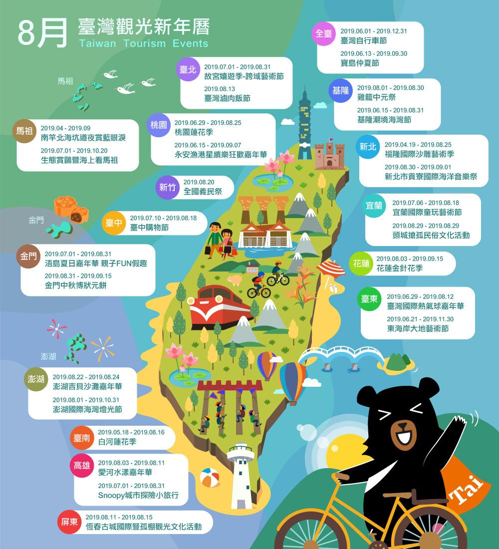 2019「臺灣觀光新年曆」8月份精彩活動出刊了,歡迎暑假計劃前往台灣旅遊的朋友多加利用,掌握台灣最新觀光動態!請前往觀光局電子報網站: https://bit.ly/32Ievhv