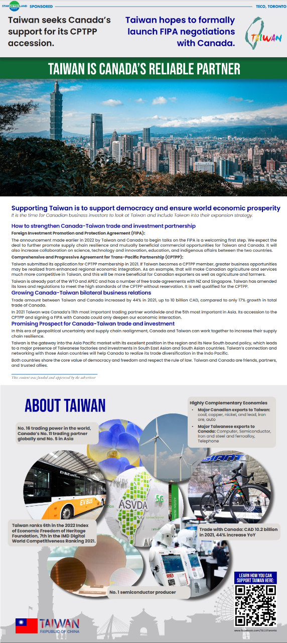 Foreign Investment Promotion and Protection Agreement (FIPA): The announcement made earlier in 2022 by Taiwan and Canada to begin talks on the FIPA is a welcoming first step. We expect the deal to further promote supply chain resilience and mutually beneficial commercial opportunities for Taiwan and Canada. It will also increase collaboration on science, technology and innovation, education, and indigenous affairs between the two countries.