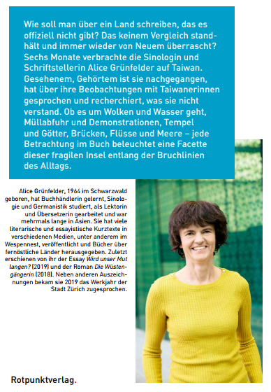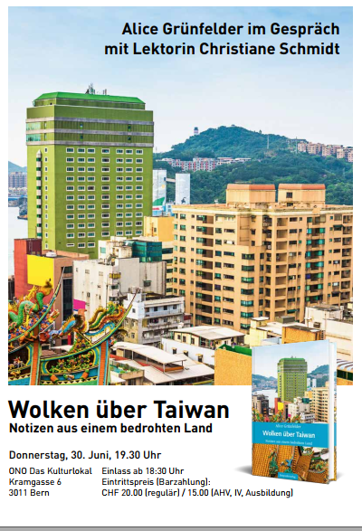 Alice Grünfelder甫出版新作Wolken über Taiwan,並將於2022年6月30日(星期四)晚間7:30-9:00在伯恩市中心ONO舉辦發表會,歡迎共襄盛舉: https://www.onobern.ch/events/alice-gruenfelder/