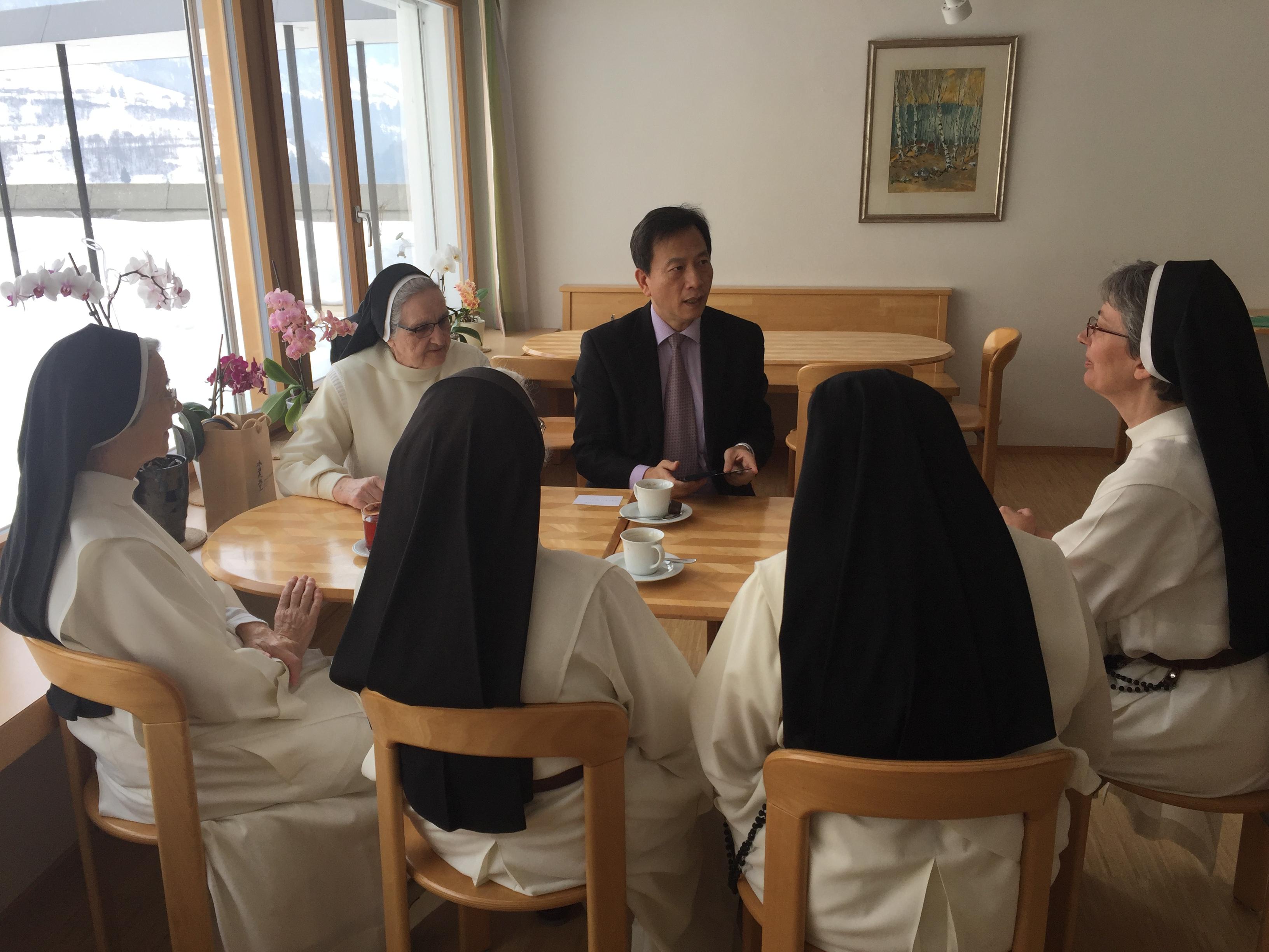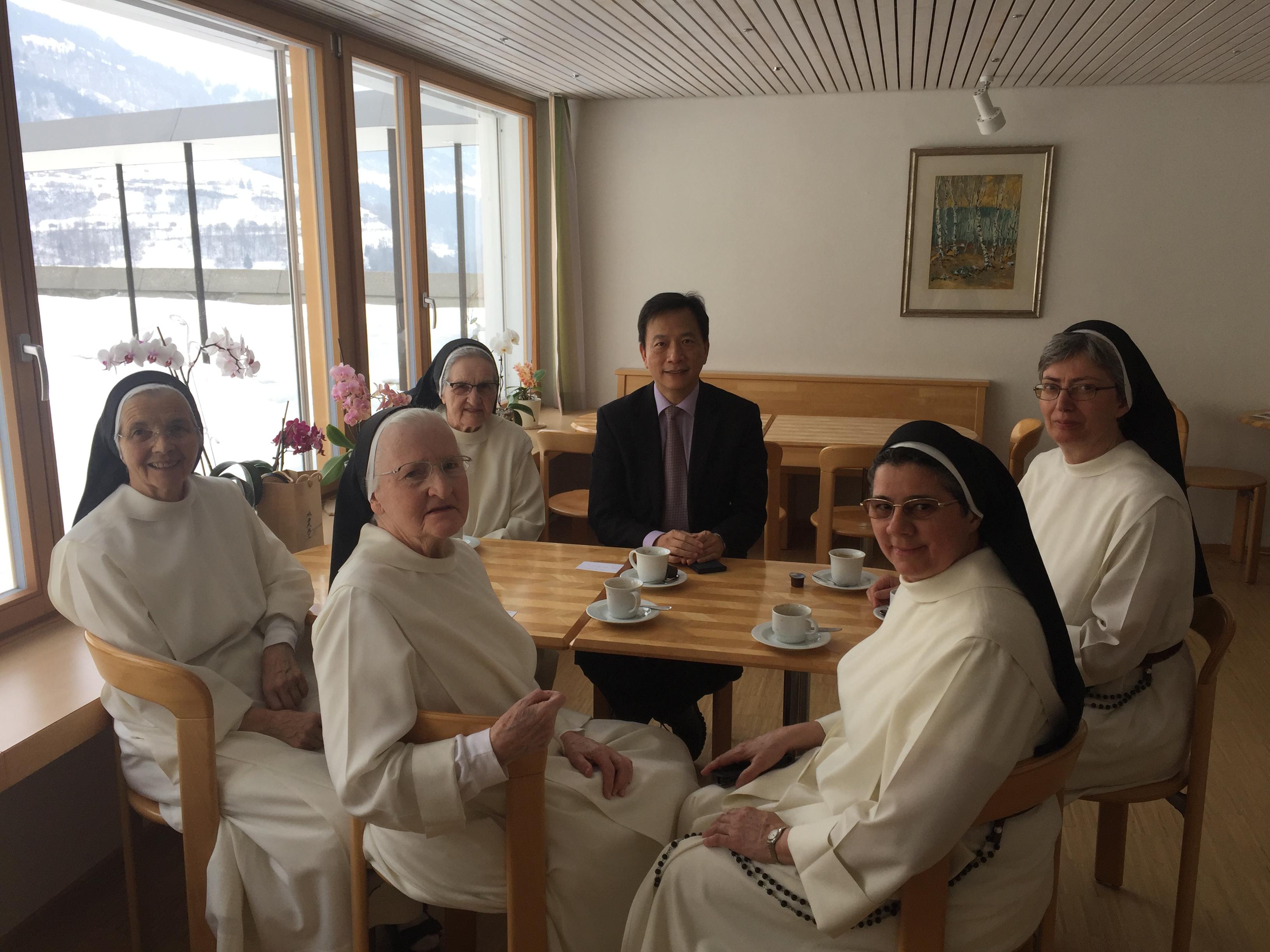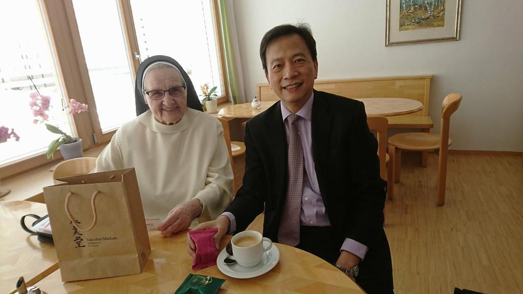 本處谷代表瑞生於本(107)年2月23日赴瑞士Ilanz鎮「聖若瑟道明修女會」總部(Kloster Claustra)探訪在臺服務達57年現年87歲之范素蘭修女(Sr. Amata Fässler) 及服務55年之Assumpta修女,感謝兩位修女長期在臺服務,關心目前生活情形。