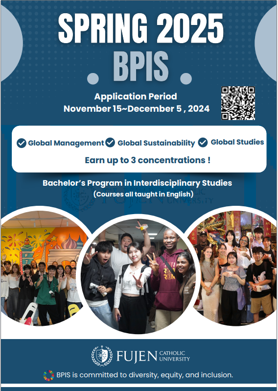 The Bachelor’s Program in Interdisciplinary Studies (BPIS) is Fu Jen University’s first all English-taught program for international students. Graduates of this program can earn up to three concentrations in: global management, global sustainability, and global studies. In this unique program, students will have an international learning environment and gain international experiences through industry-academia collaboration (in both international and local companies) and social engagement.