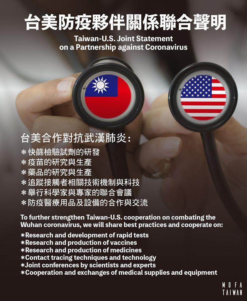 外交部與美國在台協會台北辦事處(AIT/T)於本3月18日共同發表臺美防疫夥伴關係聯合聲明,展現臺美攜手對抗武漢肺炎疫情的決心。雙方將在臺美密切合作交流的既有成果基礎上,推動更快速以及更多層面的合作,共同維護全人類的健康安全。(E)