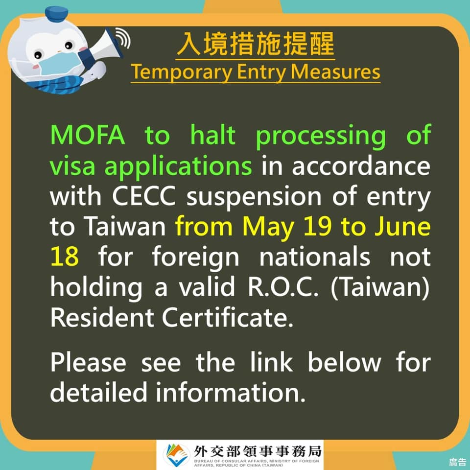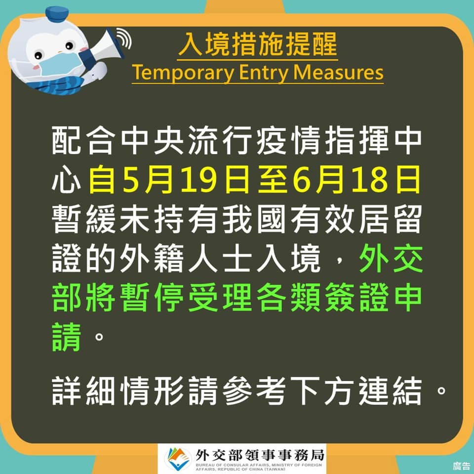 Se prohibe el ingreso en Taiwán extranjeros no residentes a partir de las 00:00 horas del 19 de mayo, hasta el 18 de junio de 2021, cambios sujetos a lo que estipula el Centro de Comando Central de Pandemia (CECC).
