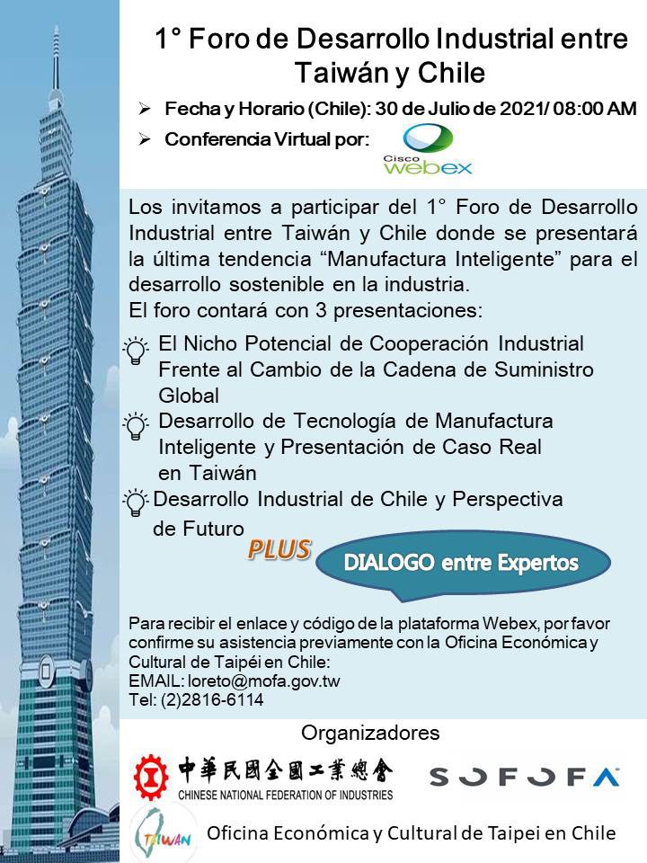 Les invitamos a todos a participar en el Primer Foro de Desarrollo Industrial entre Taiwán y Chile, donde se presentará la última tendencia de “Manufactura Inteligente” para el desarrollo sostenible de la industria.