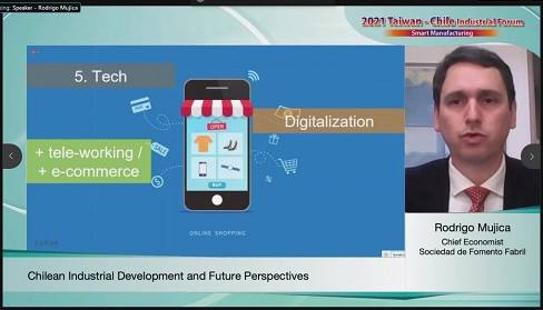 台灣為全球高科技產業鏈不可或缺之重要夥伴,而智利為南美洲產業及科技最先進國家,台智兩國產業結構及屬性雖不相同,惟雙方均瞭解在疫情衝擊下,維持產業永續發展之重要性,因此首屆產業論壇焦點即以「智慧製造」為主題進行技術交流及經驗分享,我方由中華經濟研究院WTO及RTA中心徐遵慈副研究員及電電公會謝清福主任委員解析全球供應鏈移轉趨勢、臺智產業合作利基、台灣智慧製造技術現況及成功經驗,智利工總首席經濟學家Rodrigo Mujica就智利產業發展與前景進行闡述;此外,中華經濟研究院李淳資深副執行長及智利工總國際處長Manuel José Prieto共同擔任引言人,帶領台智專家進行產業對話及剖析。