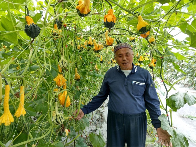 En esta imagen reciente se observa a Lu Sung-chang, un agricultor de 62 años de edad, exhibiendo las coloridas y multiformes calabazas cosechadas en su granja en el sureño distrito de Pingtung. Con más de 20 años de experiencia en el campo, Lu produce 10 tipos de calabazas comestibles y más de 50 variedades con fines de exhibición. La granja de calabazas de Lu será parte de la Exposición de Agricultura Tropical de Pingtung que tendrá lugar del 29 de enero al 17 de febrero. (Foto cortesía de la Agencia de Agricultura y Alimentos, vía CNA)