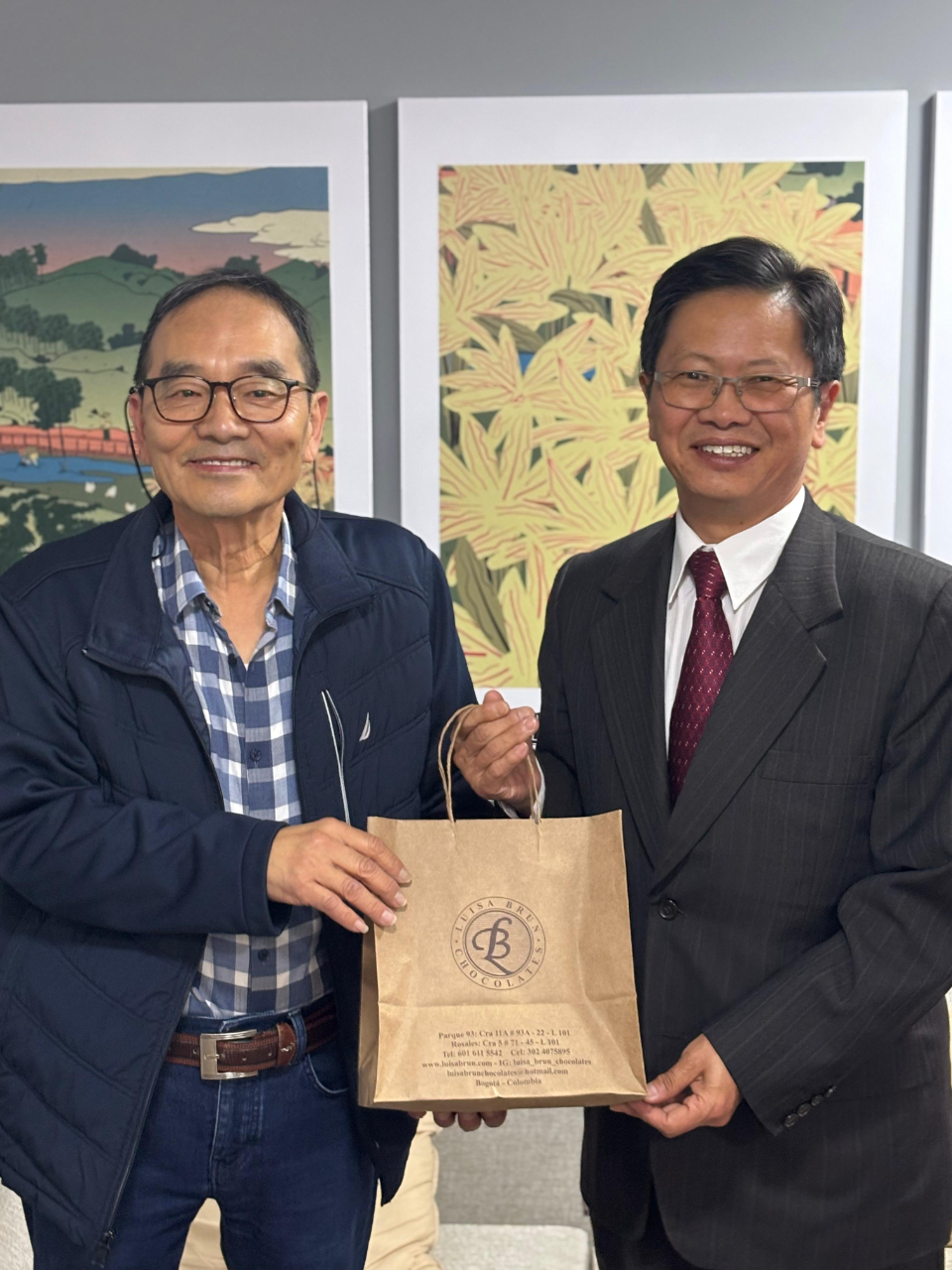 朱代表於本(114)年6月26日拜訪台商會副會長潘振中經營的咖啡公司,近年來哥國之國際精品咖啡消費市場逐漸崛起,潘副會長設立Don Elias公司跨足精品咖啡(Specialty Coffee)栽種及行銷,另與台灣友人合資興建商用不動產用於高等教育租賃業,充分展現多角化經營的靈活策略。潘副會長旅居哥國數十年來,建立寬廣的政商人脈,積極推動國民外交,持續攜手旅哥國台商,發揮勇敢創業的台灣精神,朱代表對其熱心僑務貢獻僑社,深表肯定及讚揚。