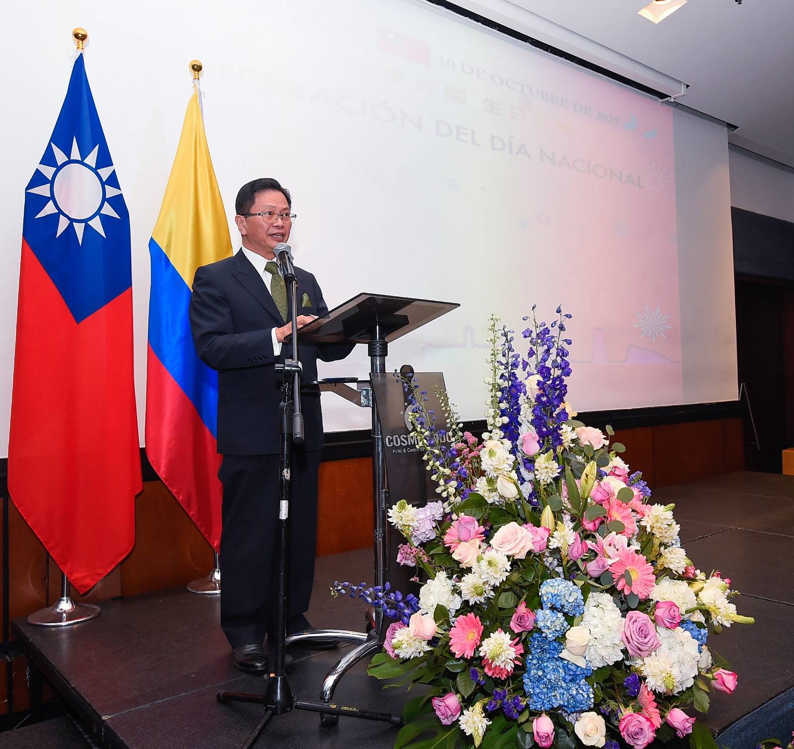 駐哥倫比亞代表處於2025年10月7日晚間假波哥大 Cosmos 100 飯店隆重舉行中華民國(臺灣)第114週年國慶酒會。現場冠蓋雲集、氣氛熱烈,計有哥倫比亞10餘位參眾議員、教廷、瓜地馬拉與巴拉圭等國駐使、友好公私協會、媒體人士及僑界代表逾兩百人蒞臨,共同慶祝臺灣國慶,見證臺哥堅實友誼與日益深化的雙邊合作。