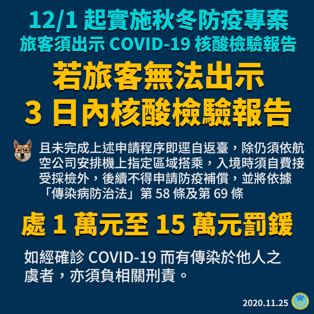 指揮中心指出,國際疫情持續嚴峻,預期今年底及明年初入境旅客數將增加,為加強防疫安全,自12月1日至明(2021)年2月28日(啟程地時間),入境我國機場或經我國機場轉機的旅客,不論身分(本國籍與外國籍人士等)或來臺目的(求學、工作、外交公務等),均應檢附「表訂登機時間前3日(工作日)內COVID-19核酸檢驗陰性報告」,始可登機來臺,並將由交通部督導各航空公司確實把關;若旅客抵臺後發現檢驗報告不實,或拒絕、規避、妨礙相關檢疫措施,得依傳染病防治法第58條及69條規定,處新臺幣1萬至15萬元罰鍰。檢驗報告不實部分,亦將追究偽造文書印文罪之刑責。