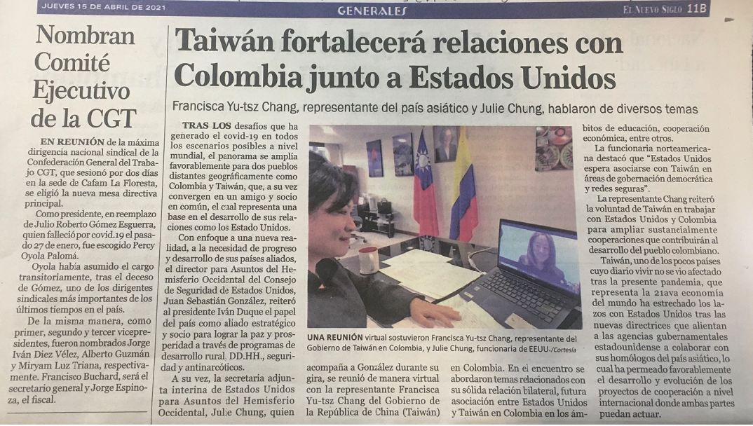 哥倫比亞主流媒體「新世紀報」(El Nuevo Siglo)於本(110)年4月15日報導「臺灣將與美國合作加強與哥倫比亞關係」消息,內容詳述全球各國在新冠肺炎(COVID-19)挑戰下,均受到不同程度的影響。哥倫比亞與臺灣兩國雖地理距離遙遠,雙邊關係在共同的盟友暨發展夥伴美國牽繫下,持續成長。