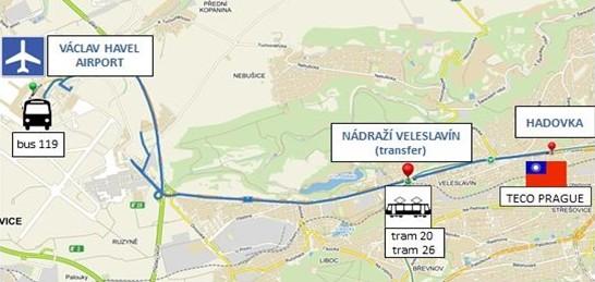 國人搭機抵達布拉格哈維爾(Vaclav Havel)國際機場後,可搭乘119號巴士至A線地鐵站Nadrazi Veleslavin站下車,換搭開往Sidliste Barrandov方向之20路或前往Nadrazi Hostivar之26路電車至HADOVKA站下車,沿人行道向前走約100公尺,右邊辦公大樓C棟四樓即為駐捷克代表處,入口處並有該處名址標示牌。