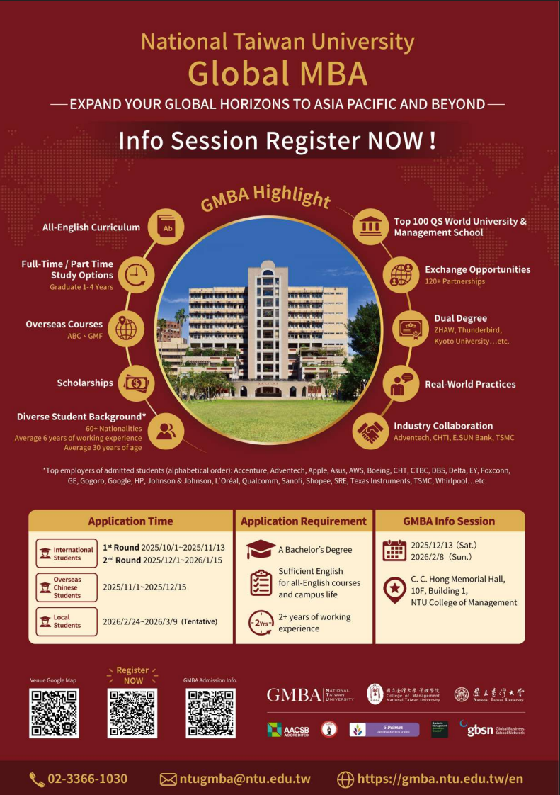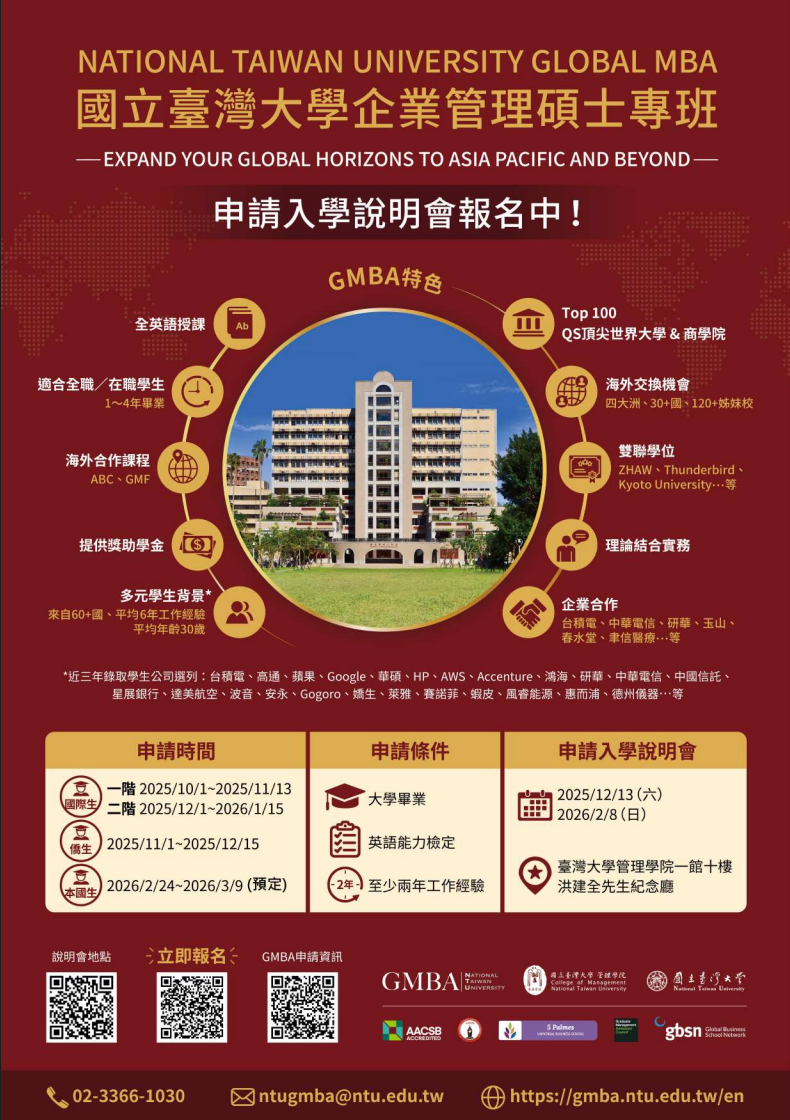 The NTU Global MBA Program is an English-taught business management program with a proud 95-year legacy. It emphasizes both theory and practice, aiming to cultivate international entrepreneurs and business leaders. To date, more than 900 students from over 60 countries have participated in the program.
