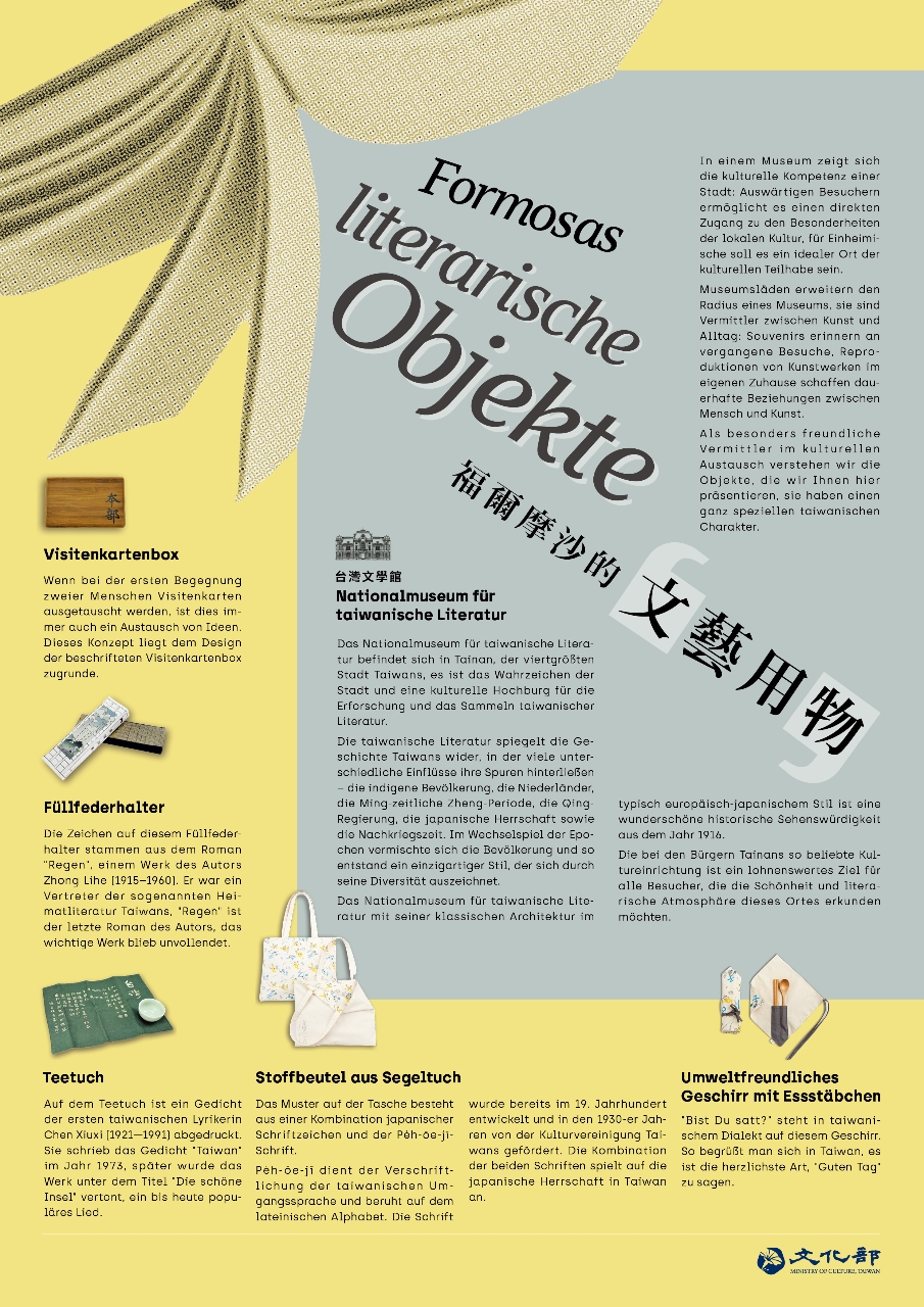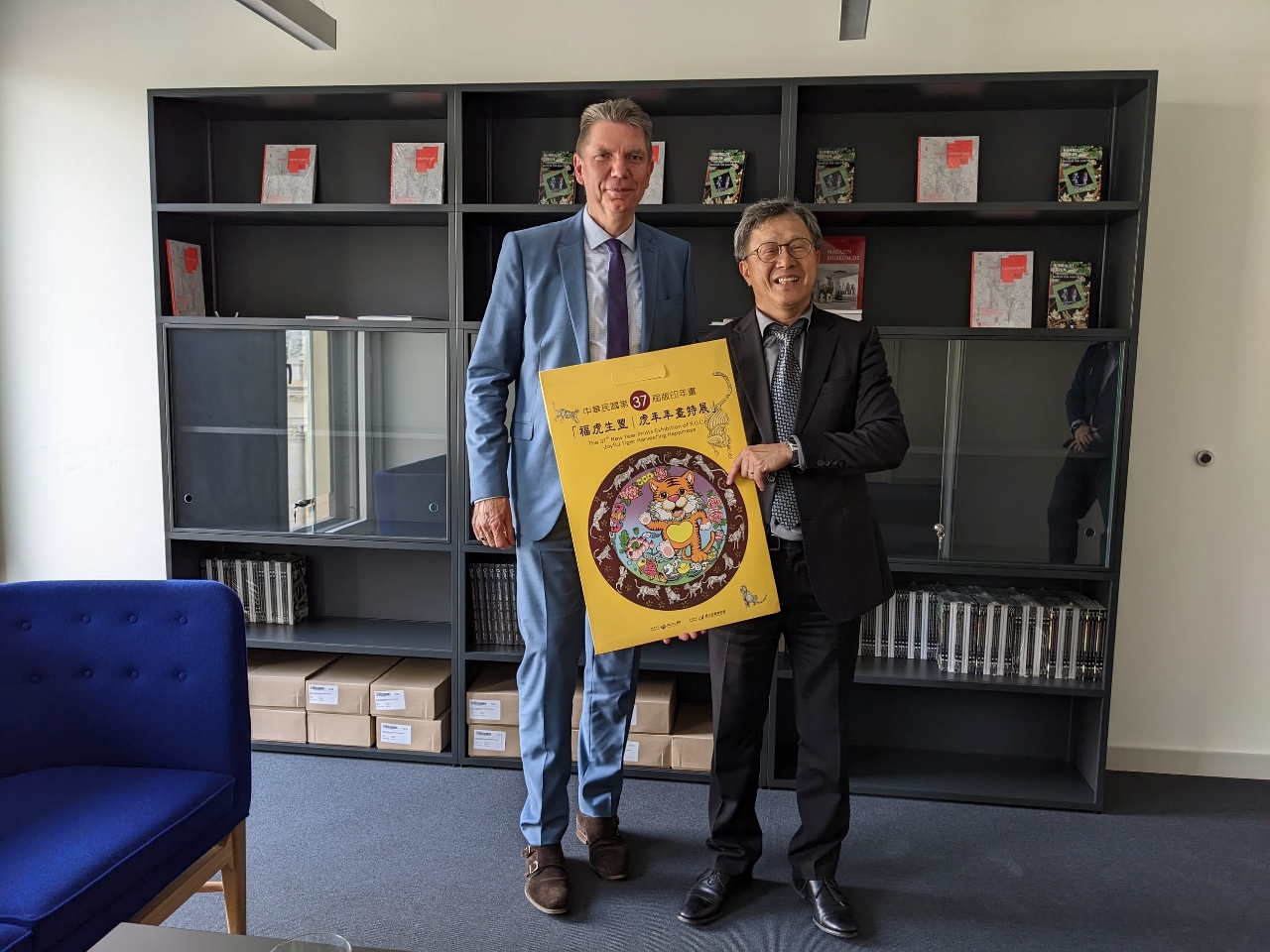 謝大使致贈博物館總監Lars-Christian Koch國立臺灣美術館的虎年年節版畫,為其介紹虎年年畫的意涵;另贈送博物館工作人員國立台灣文學館文創品「品詩 · 福爾摩沙」茶巾茶杯組,茶巾上印有臺灣女詩人陳秀喜(1921-1991)的詩作〈台灣〉,該詩寫於1973年,後來改編為歌曲〈美麗島〉,至今備受傳唱。