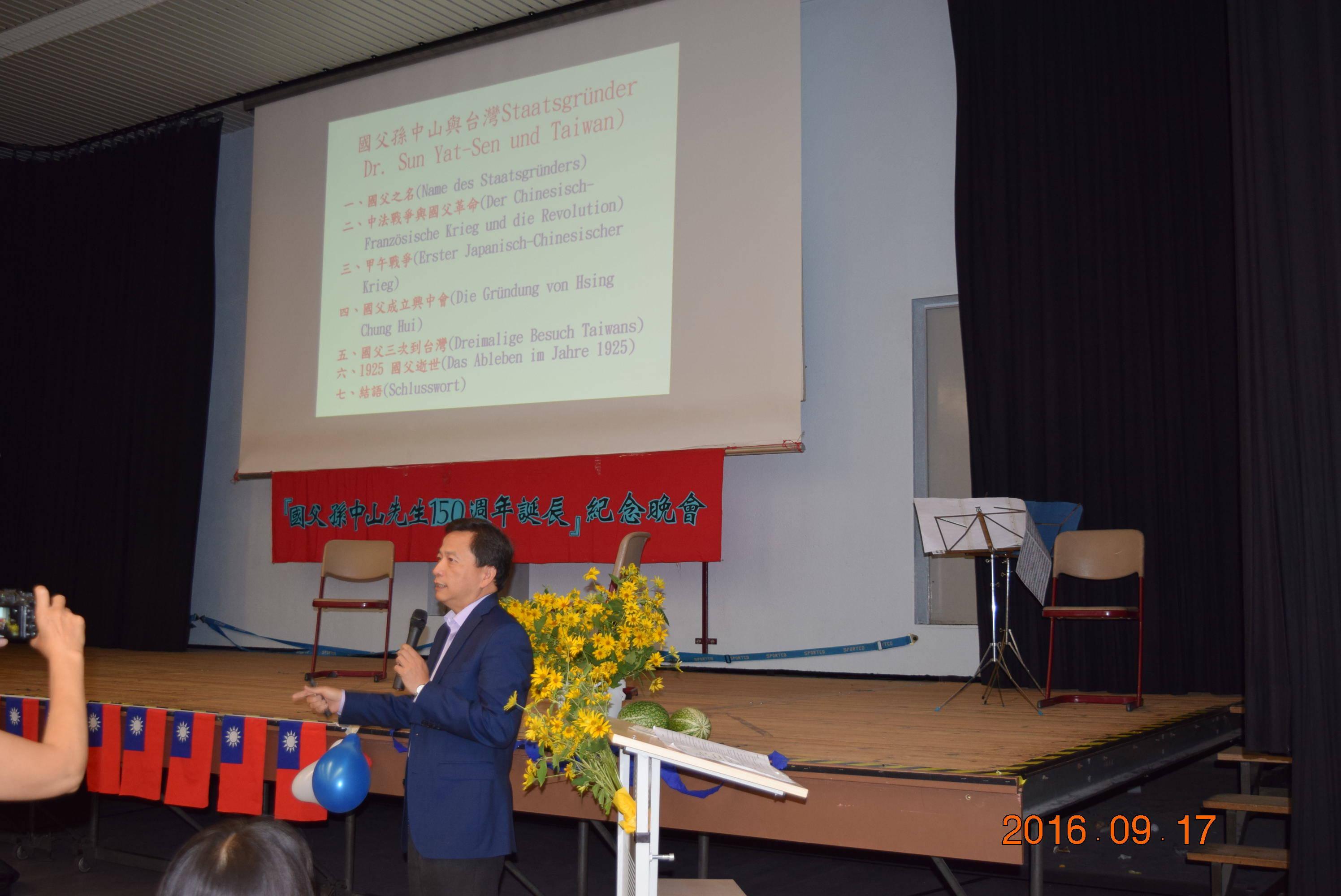 本(9)月17日晚由柏林中華文化協會聯合柏林各僑團及柏林中文學校共同舉辦「國父孫中山先生150 週年誕辰紀念晚會」活動,會中除播放「柏林僑社史實集錦」影片外,另有音樂演奏、舞蹈表演。主辦單位並邀請駐德國代表處谷瑞生公使演講「國父與台灣」,谷公使說明國父之名的來源、中法戰爭與國父革命之關聯、國父成立興中會及國父三次訪問台灣,最後說明國父逝世,北京台灣同學會致贈輓聯「三百萬台灣剛醒同胞微先生何人領導:四十年祖國未竟事業捨我輩其誰分擔」,尤屬感人。當晚約有80餘位柏林僑界人士及德國友人與會。(E)