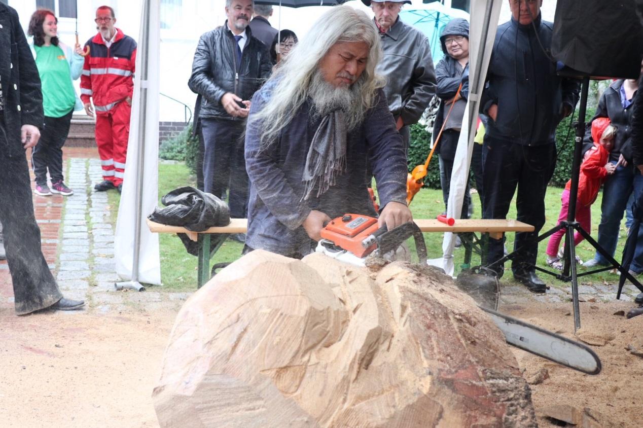 揭幕典禮於聖尼古拉教堂前廣場舉行,本處謝大使、康大師、D市S副市長及文化促進協會S會長獲邀至台前共同為作品揭幕,隨後由康大師現場表演電鋸製作木雕作品,吸引大量觀眾圍觀,並深獲觀眾之讚賞。為讓更多德國民眾瞭解康大師創作之獨特性與內涵,D市特別於市政廳舉辦藝術座談,邀請康大師暢談創作理念及心路歷程,現場提問踴躍,氣氛熱烈。會後,D市特別以晚宴招待我團一行,以示感謝。
