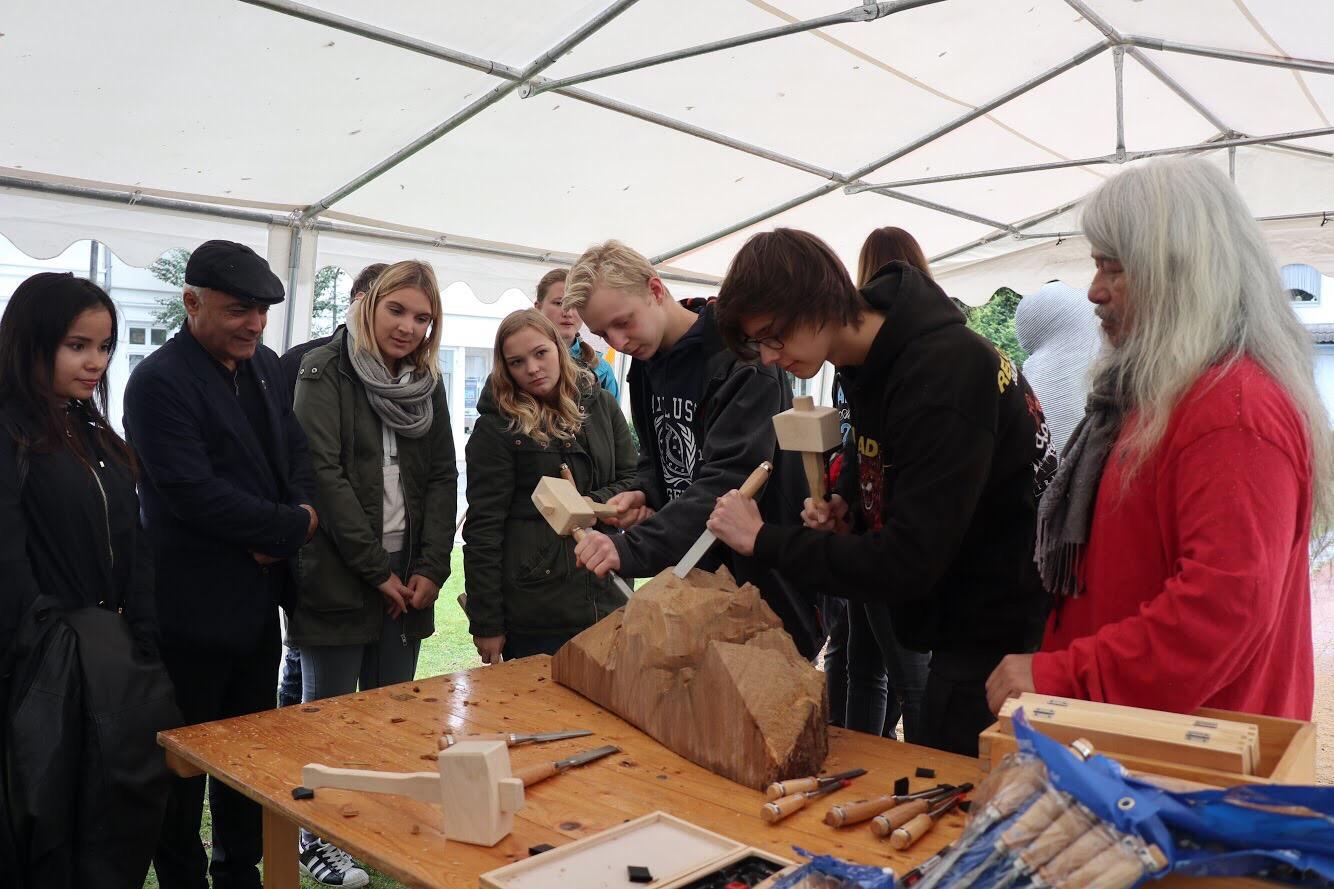 隔(9)日上午D市特地邀請康大師與12位當地高職(Fachoberschule)學生進行現場木雕教學,康大師生動活潑之講解與示範,旋即引起學生之濃厚興趣,學生們在康大師之指導下,共同完成一件趣意盎然之老鼠木雕作品。