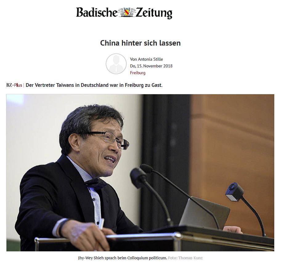 我駐德國代表謝志偉大使日前應邀赴南德弗萊堡大學(Albert-Ludwigs-Universität Freiburg)以「臺灣與其東南亞鄰國-內部觀點與分析」(Taiwan und seine südostasiatischen Nachbarn—Innenperspektiven und Analysen)為題進行專題演講,獲弗萊堡市(Freiburg im Breisgau)當地最大報巴登日報(Badische Zeitung)採訪報導當日演講內容,籲歐盟各國應與時並進調整對中政策。「臺灣不可能放棄自由而就範」,謝大使今日在其臉書粉絲頁抒發當日演講感想表示,臺灣從漫長的戒嚴中熬出骨氣,民主自由與真誠仍將獲國際社會支持。