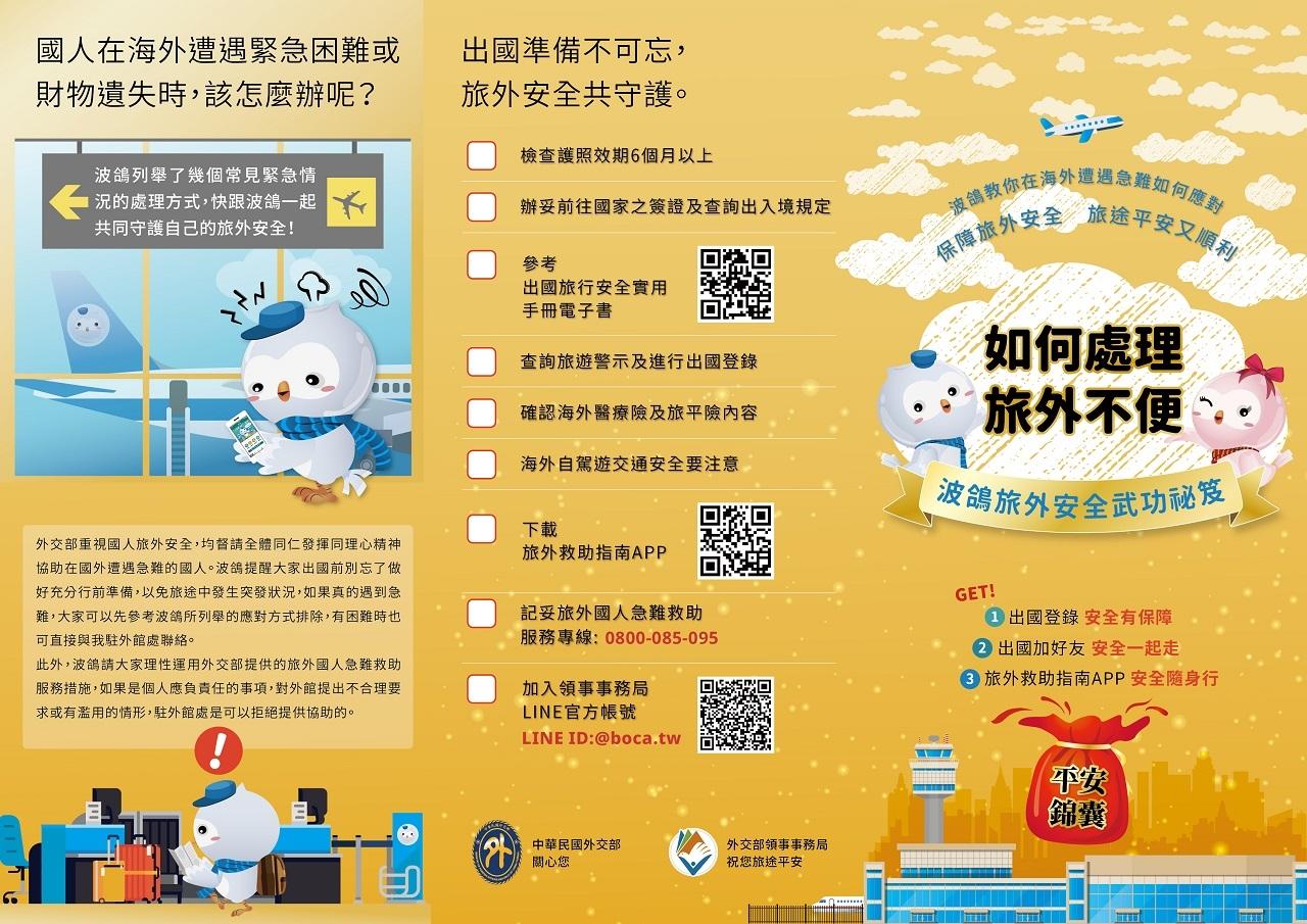 為提供國人旅外救助服務多元管道,外交部領事事務局已設置LINE官方帳號(ID:@boca.tw)及「旅外救助指南」APP,國人不僅可以透過LINE或APP即時接收外交部發布的最新旅遊警示,並進行出國登陸、查詢擬前往國家的簽證及旅遊資訊、駐外館處聯絡資訊與在海外遭遇急難的應對方式等,以提升海外旅遊自身安全,歡迎國人善加利用!