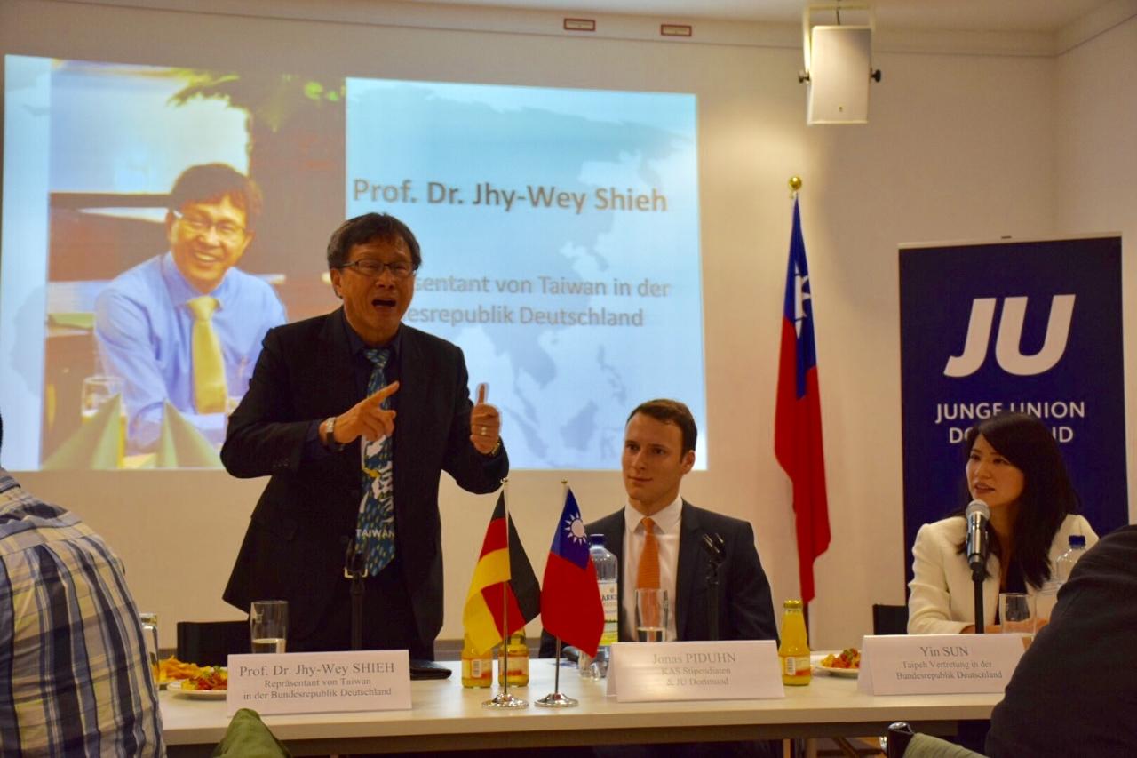 德處謝大使志偉在演講中介紹台灣民主化歷程、當前台海局勢及近日香港民眾的民主運動。演講後謝大使開始接受現場與會者提問,包括美中貿易衝突的影響、中國「一帶一路」倡議、兩岸經濟依賴度以及中國民主化前景等問題均一一深刻闡述回答。