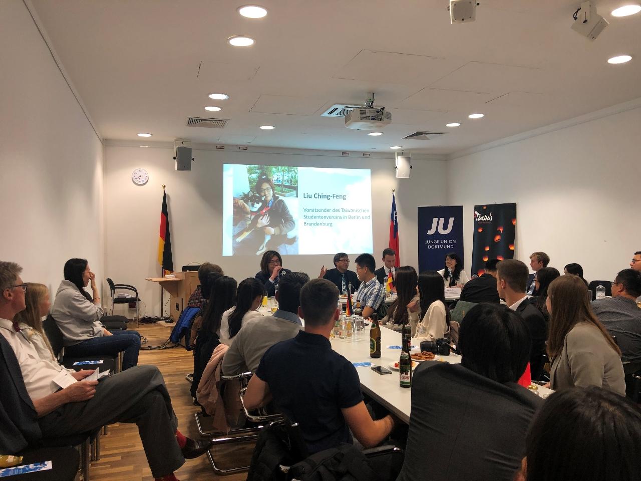 德國艾德諾基金會(Konrad-Adenauer- Stiftung, KAS)、德國基民/基社聯盟青年聯盟(Junge Union,JU) 及柏林暨布蘭登堡邦台灣同學會共同於本(108)年7月9日晚間在駐德國代表處台灣文化廳舉辦「台德青年交流座談會」(From Face to Face, ohne Book, Take a Look: Begegnung zwischen jungen Deutschen und Taiwanern),並邀請本處謝大使志偉演講,全體出席人數達95人,場面熱鬧。