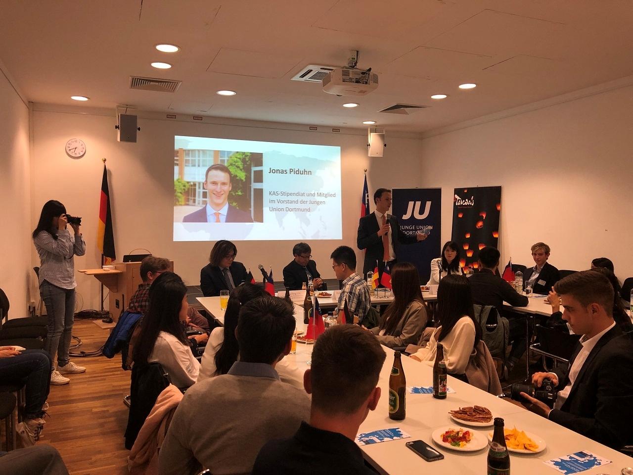 活動首先由柏林暨布蘭登堡邦台灣同學會劉會長青峰致歡迎詞感謝現場觀眾踴躍出席。JU Dortmund暨KAS獎學金獲獎生代表Jonas Piduhn致詞時表示,回顧歷史,台灣和德國有許多相似之處:30餘年前台灣受戒嚴法統治,德國仍處在東西德分裂中,兩國均在過去幾十年間,辛苦歷經民主轉型,成為一個尊重民主、自由、人權及法治的國家。