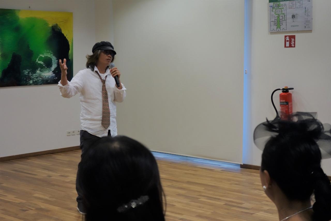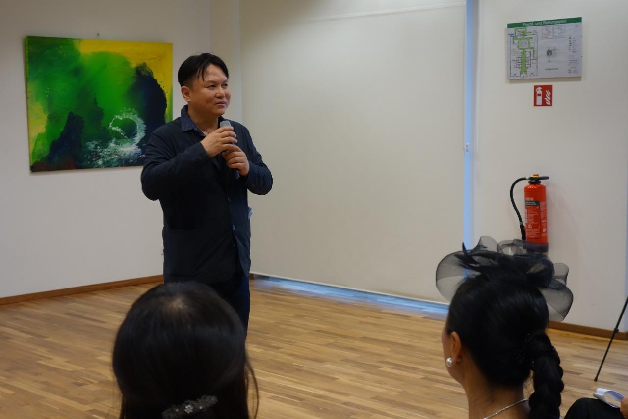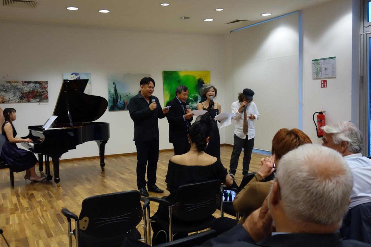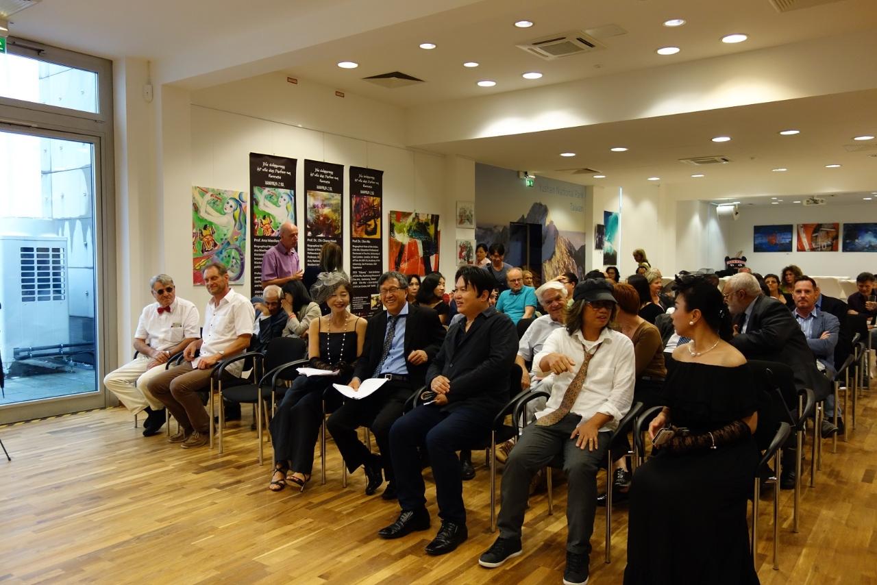 開幕活動首先邀請謝大使致詞,謝大使感謝大家冒雨前來參加,並由衷讚許各位藝術家以藝術代表臺灣,從不同面向讓國際友人體驗臺灣藝術之美,堪稱藝術大使。同時,用文字學角度以德文、日文、英文巧妙隱喻音樂、藝術與情感間的關聯,令人印象深刻。最後,感謝策展人與工作同仁的努力,讓本展得以順利完成。希望大家好好享受當晚結合音樂與繪畫的臺灣藝術沙龍。