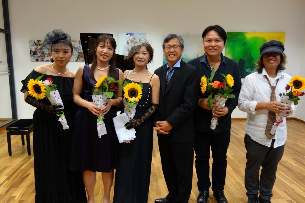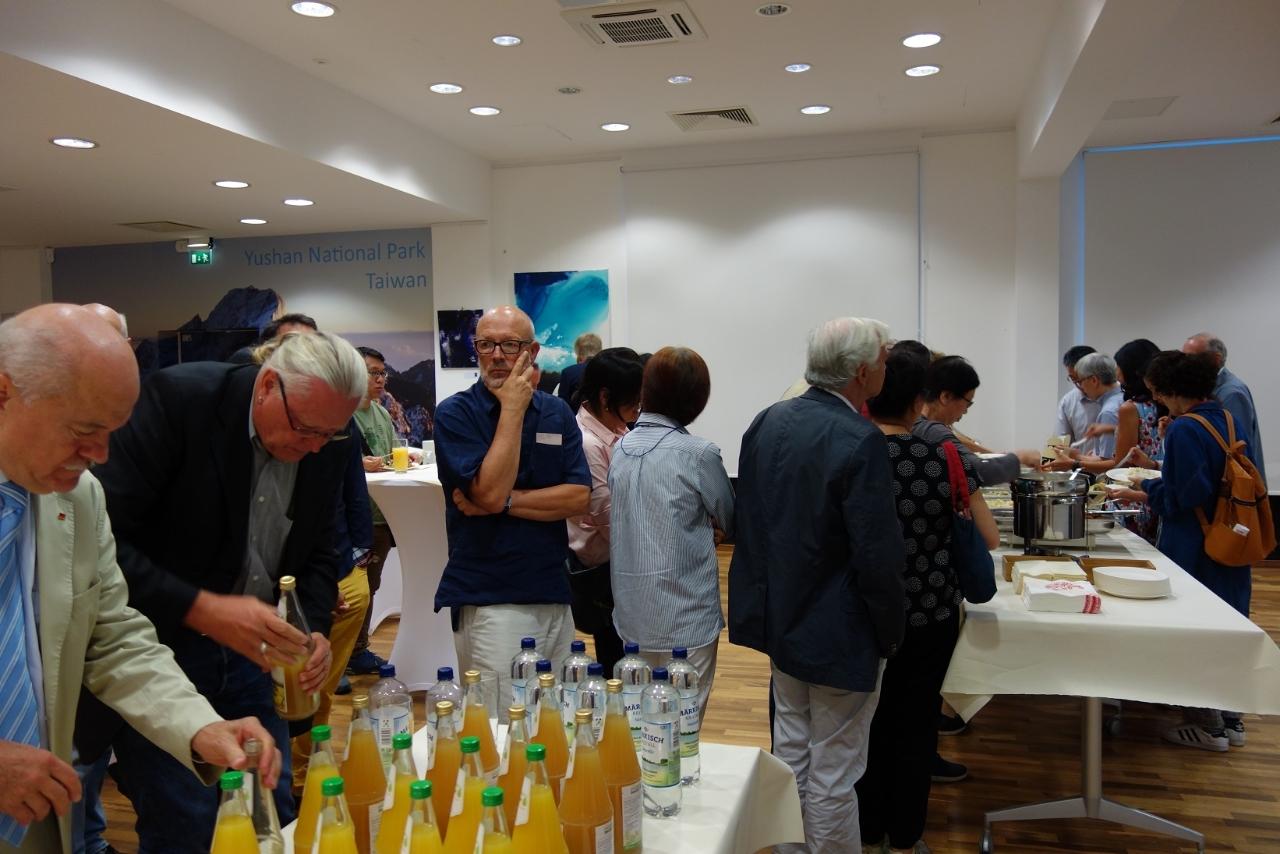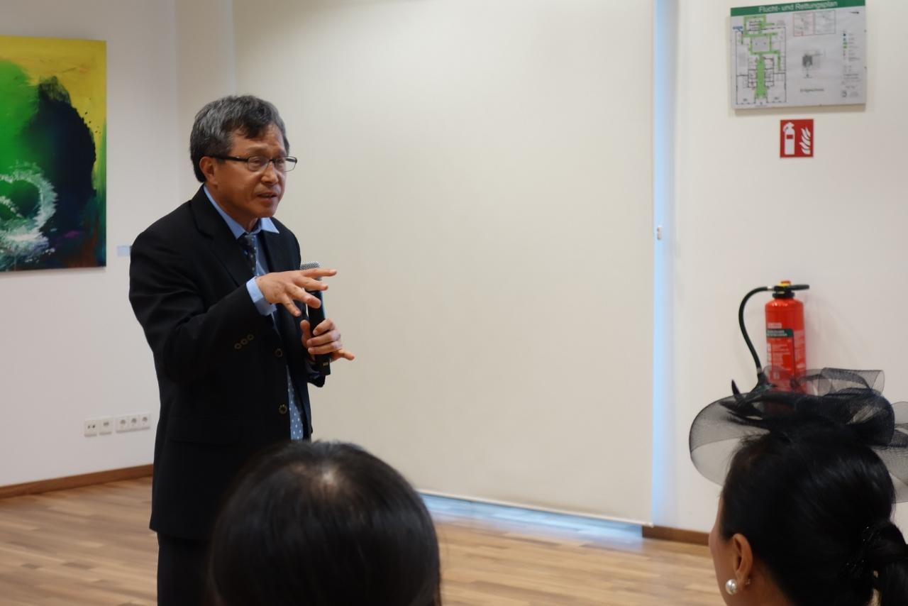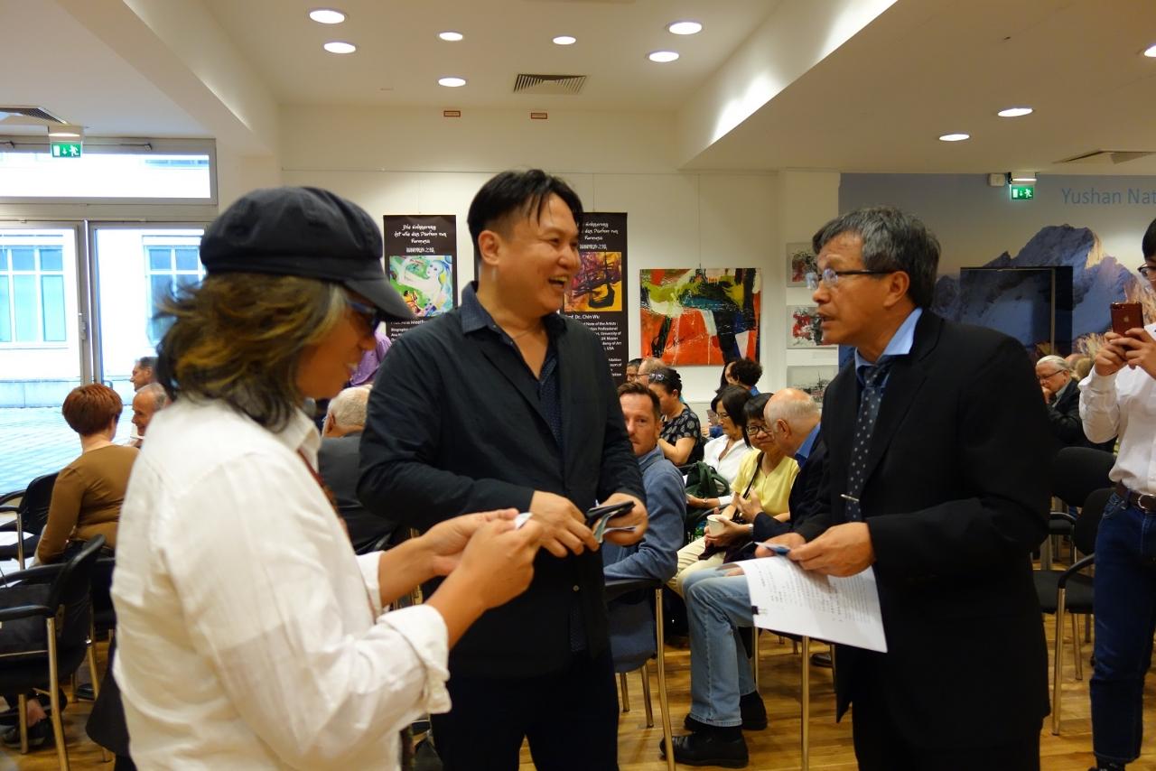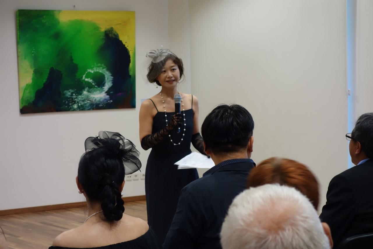 開幕活動首先邀請謝大使致詞,謝大使感謝大家冒雨前來參加,並由衷讚許各位藝術家以藝術代表臺灣,從不同面向讓國際友人體驗臺灣藝術之美,堪稱藝術大使。同時,用文字學角度以德文、日文、英文巧妙隱喻音樂、藝術與情感間的關聯,令人印象深刻。最後,感謝策展人與工作同仁的努力,讓本展得以順利完成。希望大家好好享受當晚結合音樂與繪畫的臺灣藝術沙龍。