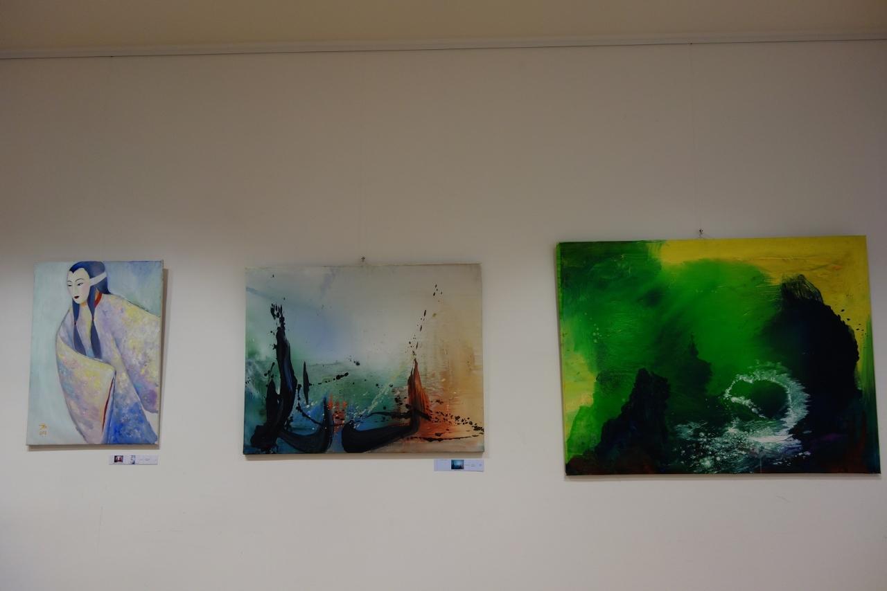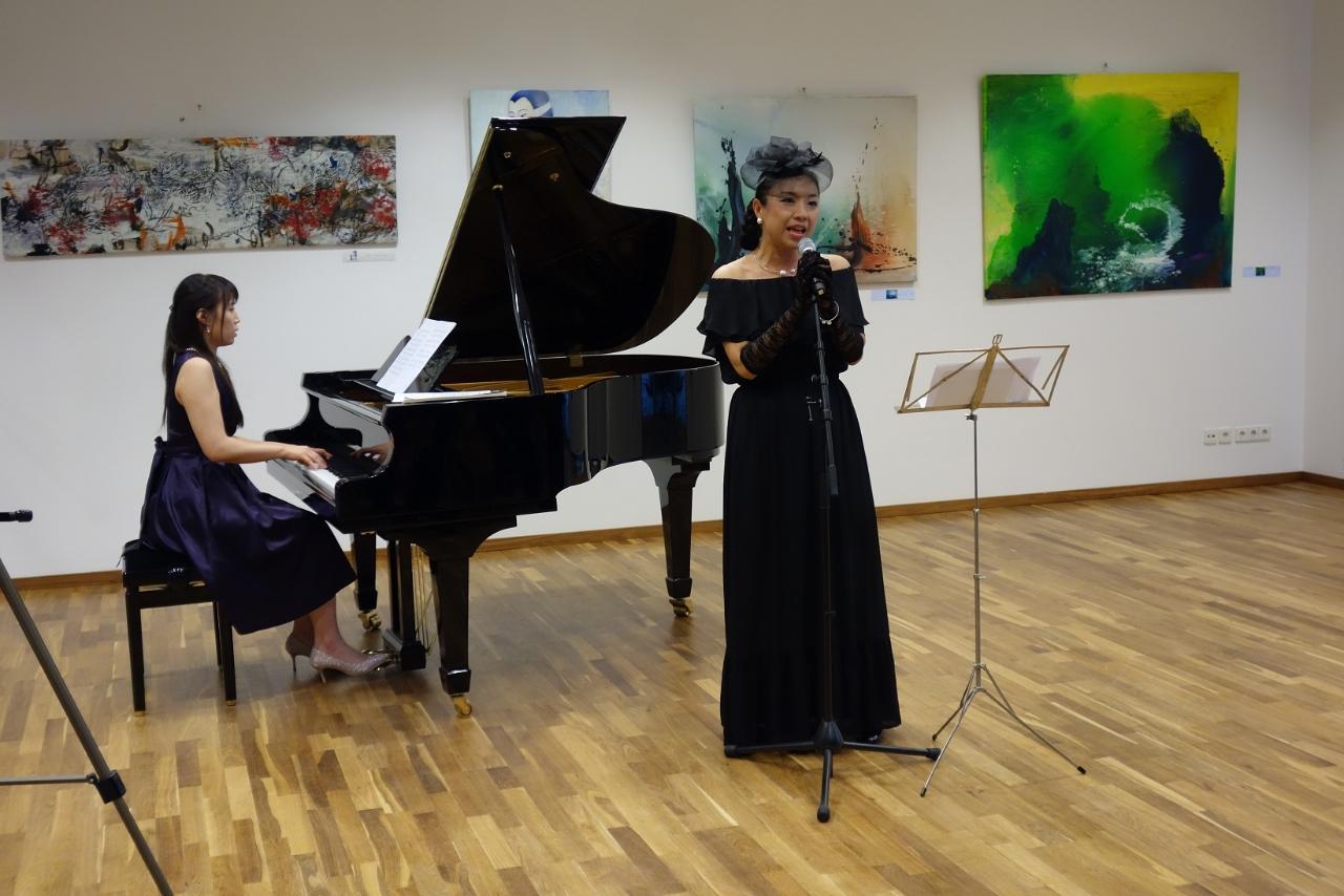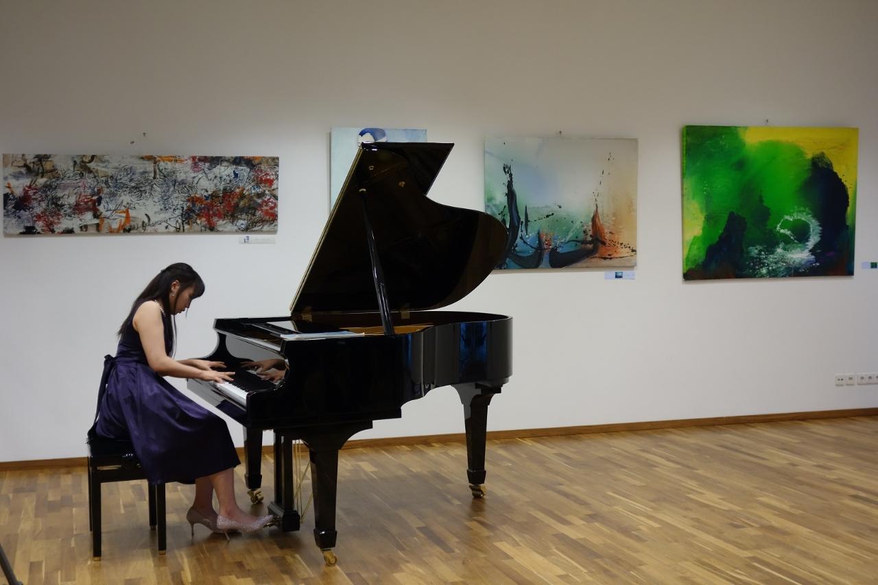 接著,由鋼琴家蔡昀晏演奏舒曼(Robert Schumann)作品拉開畫展序幕,並由策展人陳美芬一一介紹6位參展畫家作品,席間亦請出席開幕酒會的吳日勤、謝其昌教授分享其創作理念。最後,演唱日本沖繩歌謠「淚光閃閃」,並邀請謝大使上臺一起合唱由陳明章老師作詞作曲的「伊是咱的寶貝」,場面溫馨。透過音樂曲目安排的巧思,亦展現臺灣歷史發展的多元內涵。