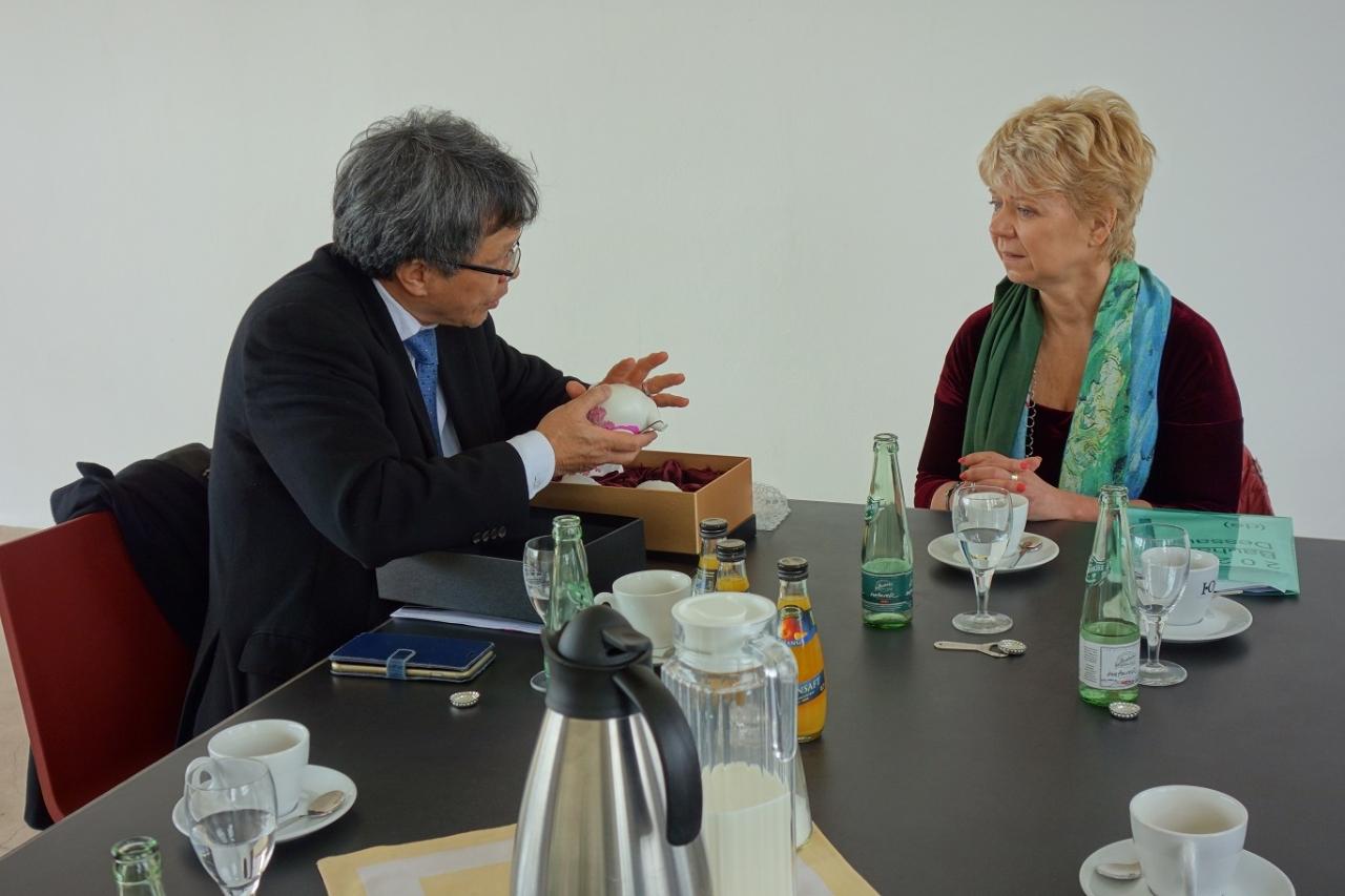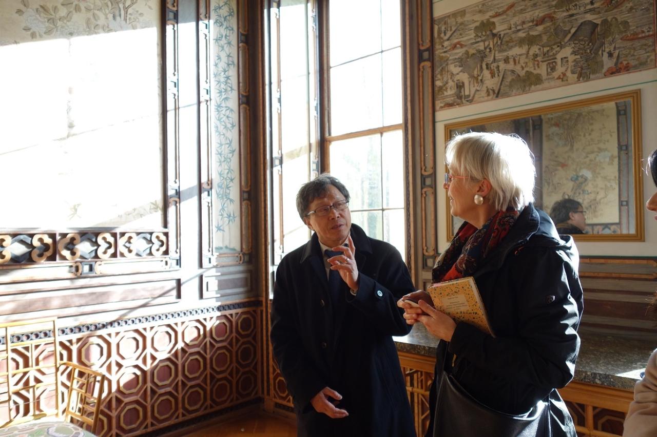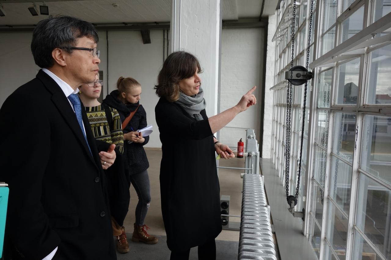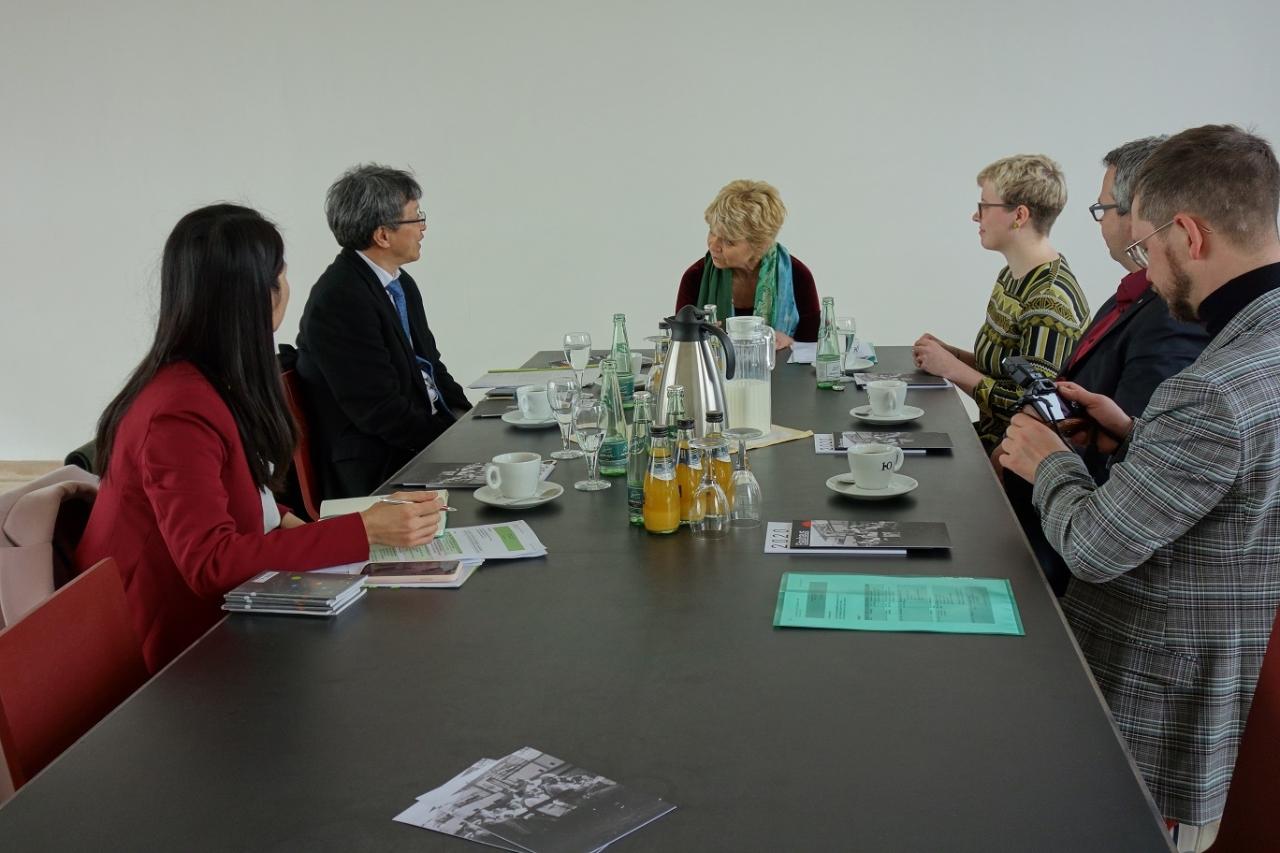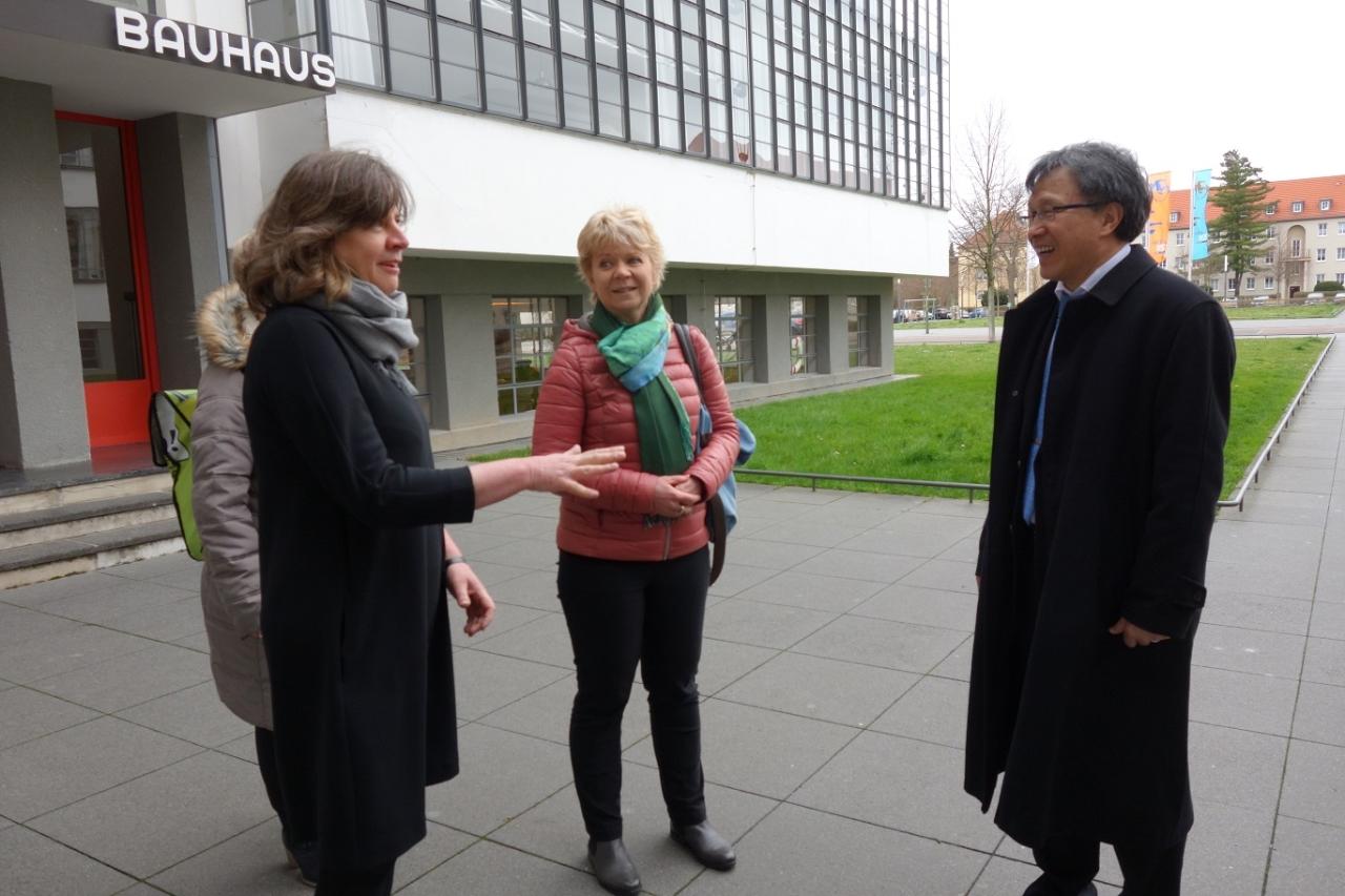 謝大使訪團一行3人抵達包浩斯基金會時,呂德曼議員、包浩斯博物館副館長比特納(Dr. Regina Bittner)及薩安邦邦政府文化與媒體事務專員穆拉蒂迪斯(Daniel Mouratidis)在門口迎接,並由比特納副館長導覽包浩斯校舍的經典設計特色,包括廳廊空間設計、天花板與地板協調性設計、燈飾巧思、窗戶採光等,無不令人驚嘆即使是百年前的設計,仍極具現代感,再次印證為何「包浩斯」學派可成為20世紀最具權威及影響力的創意思維。
