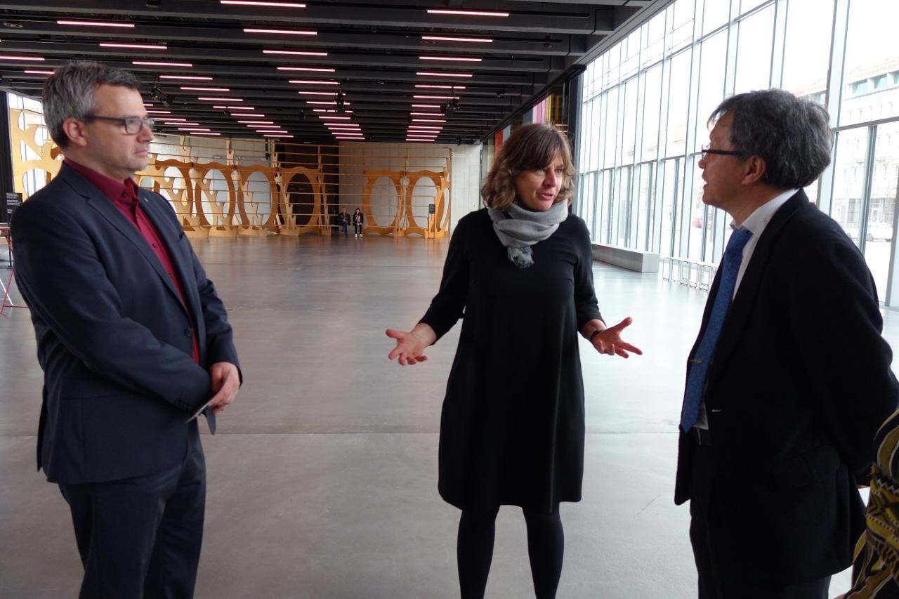 謝大使訪團抵達包浩斯基金會,邦議員呂德曼(Cornelia Lüddemann)(中)與包浩斯博物館副館長比特納(Dr. Regina Bittner)(左)於門口迎接