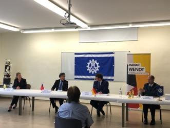 圖片 1 國會議員Marian Wendt議員(右二)主持防疫物資援贈座談,Torgau市長Romina Barth(左一)及THW薩邦事務高級專員Manuel Almanzor在座。