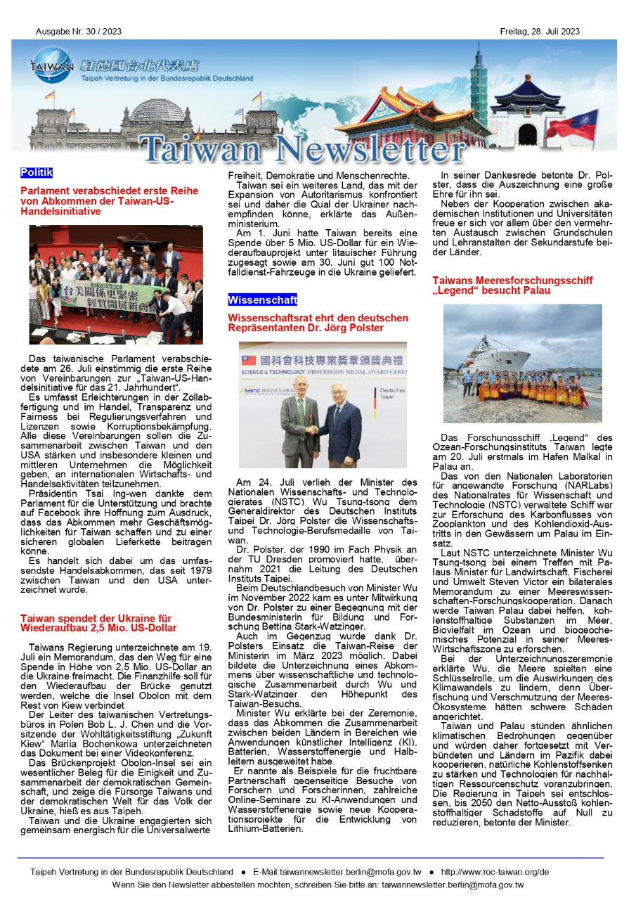 Taiwan Newsletter28.07.2023 - Taipeh Vertretung in der Bundesrepublik Deutschland 駐德國台北代表處 :::