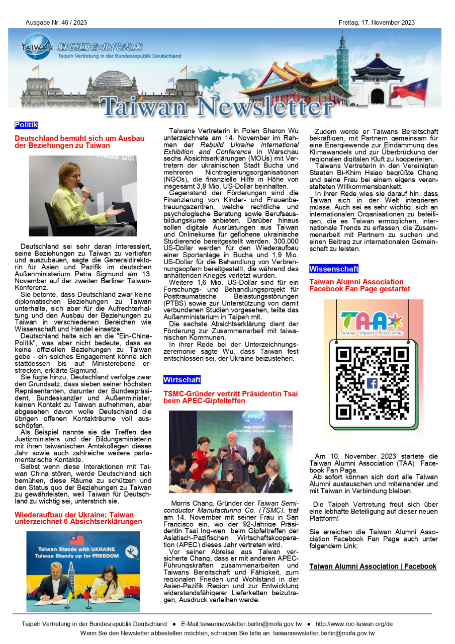 Taiwan Newsletter 17.11.2023 - Taipeh Vertretung in der Bundesrepublik Deutschland 駐德國台北代表處 :::