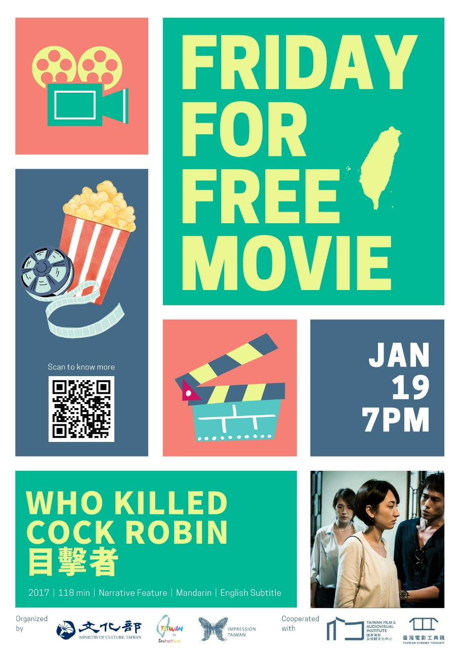 Ab dem 19. Januar zeigt die Kulturabteilung der Taipeh Vertretung in Berlin freitagabends taiwanische Filme: Die Filmreihe Friday Night Movie Night 2024 startet mit dem Film "Who killed Cock Robin"! Um Anmeldung wird gebeten unter taiwanevent@moc.gov.tw oder online über https://forms.gle/2NLiDCw1LFNww414A .