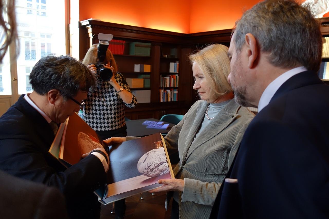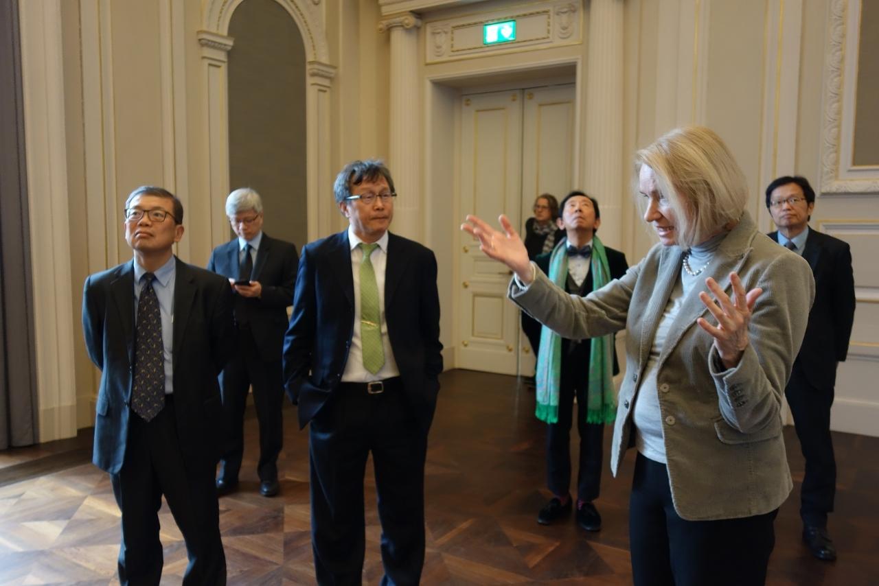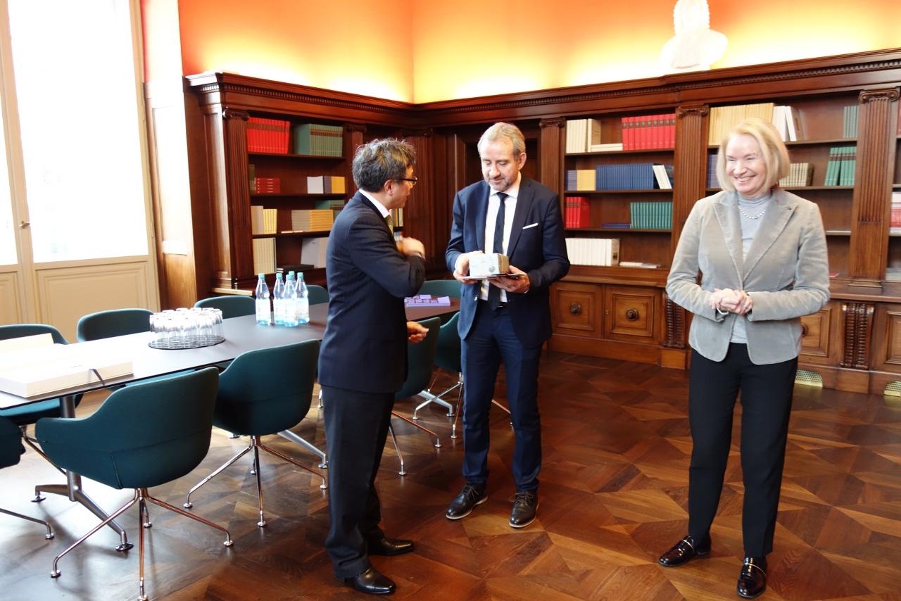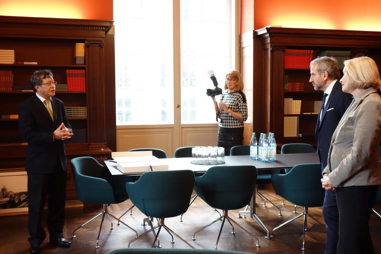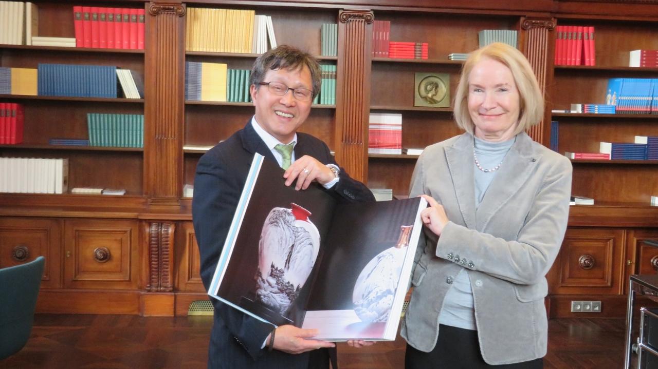 Am Nachmittag des 10. Februar besuchte der Repräsentant Taiwans in Deutschland, Prof. Shieh Jhy-Wey, mit den Abteilungsleitern der Vertretung das Büro der Generaldirektorin der Staatsbibliothek zu Berlin, um zwei hochwertige Drucke einer Aufnahme der Berliner Museumsinsel aus dem Jahr 1900 und den exklusiven Sammlerkatalog mit traditioneller, modern aufgelegter, taiwanischer Porzellankunst der Franz Collection im Büro der Generaldirektorin der Staatsbibliothek zu Berlin als Schenkung an die Stiftung Preußischer Kulturbesitz und die Staatsbibliothek zu Berlin zu überreichen. Entgegengenommen wurden die Kunstwerke vom Präsidenten der Stiftung Preußischer Kulturbesitz Herrn Prof. Dr. Hermann Parzinger und der Generaldirektorin der Staatsbibliothek Frau Barbara Schneider-Kempf. Auch der Direktor der Ostasienabteilung, Matthias Kaun, nahm an der Zeremonie teil.
