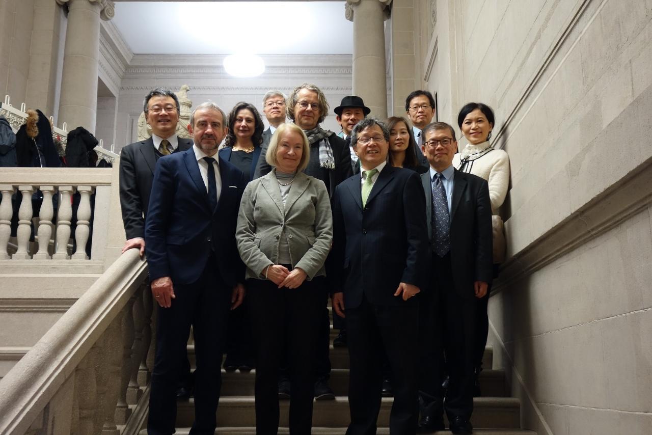 Im Anschluss überreichte Professor Shieh im Namen von Herrn Hsü der Staatsbibliothek einen exklusiven, weltweit auf 100 Exemplare limitierten, Katalog taiwanischer Porzellankunst, deren Schönheit einen tiefgehenden Eindruck der traditionellen Handwerkskunst vermittelt, für die Ostasienabteilung: "French Blue Porcelain Classics 100" der Franz Collection. Als persönliches Geschenk schließlich übergab Professor Shieh einen bekannten taiwanischen Oolong-Tee symbolisch für die taiwanische Demokratie an die Gastgeber. Professor Parzinger und Herr Kaun, die Taiwan bereits mehrfach besucht haben, und Frau Schneider-Kempf bedankten sich herzlich, und lobten Taiwan als fortschrittliches Land mit demokratischer und kultureller Vielfalt und betonten, welchen Eindruck Taiwan bei ihnen hinterlassen hat. Botschafter Shieh versprach, auch Frau Schneider-Kempf die Gelegenheit zu vermitteln, die Schönheit Taiwans persönlich zu erleben. Der gelungene kulturelle Austausch wurde zum Abschluss durch ein Gruppenfoto dokumentiert und besiegelt.