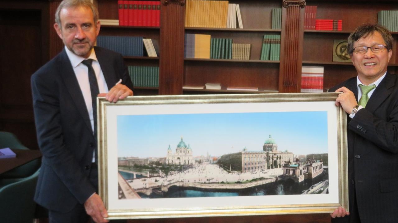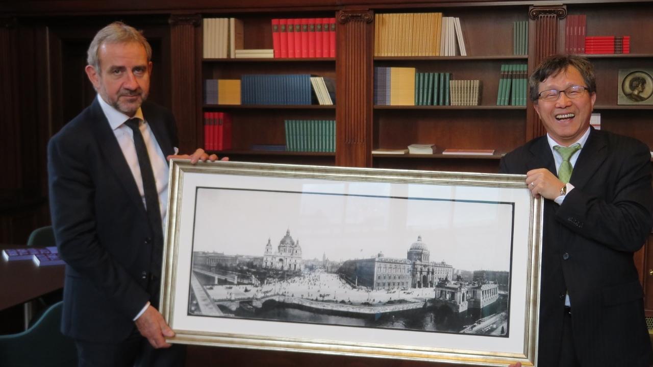 Die Delegation der Repräsentanz wurde von der Direktorin Schneider-Kempf empfangen und durch die Hallen des 1661 als Kurfürstliche Bibliothek errichteten Gebäudes geleitet. Professor Shieh begrüßte zunächst die Gäste und betonte, wie sehr es ihm am Herz liege, diese beiden Geschenke im Namen seines Landes zu überreichen. Das Original des 120 Jahre alten Fotos wurde von Hsü Chung-Mao, dem Geschäftsführer der Xinshiyu Culture Co., Ltd., voller Alterungsspuren und gelber Flecken bei einem deutschen Antiquariat erworben: die beiden Panoramen zeigen das alte Berliner Schloss (heute "Humboldt-Forum") und die Museumsinsel. Nach digitaler Scanverarbeitung, High-Tech-Retusche, einem aufwendigen Farbwiederherstellungsverfahren mit moderner High-End-Technologie aus Taiwan erstrahlte die Aufnahme in alter Pracht, um dann auf die Reise nach Deutschland zu gehen.