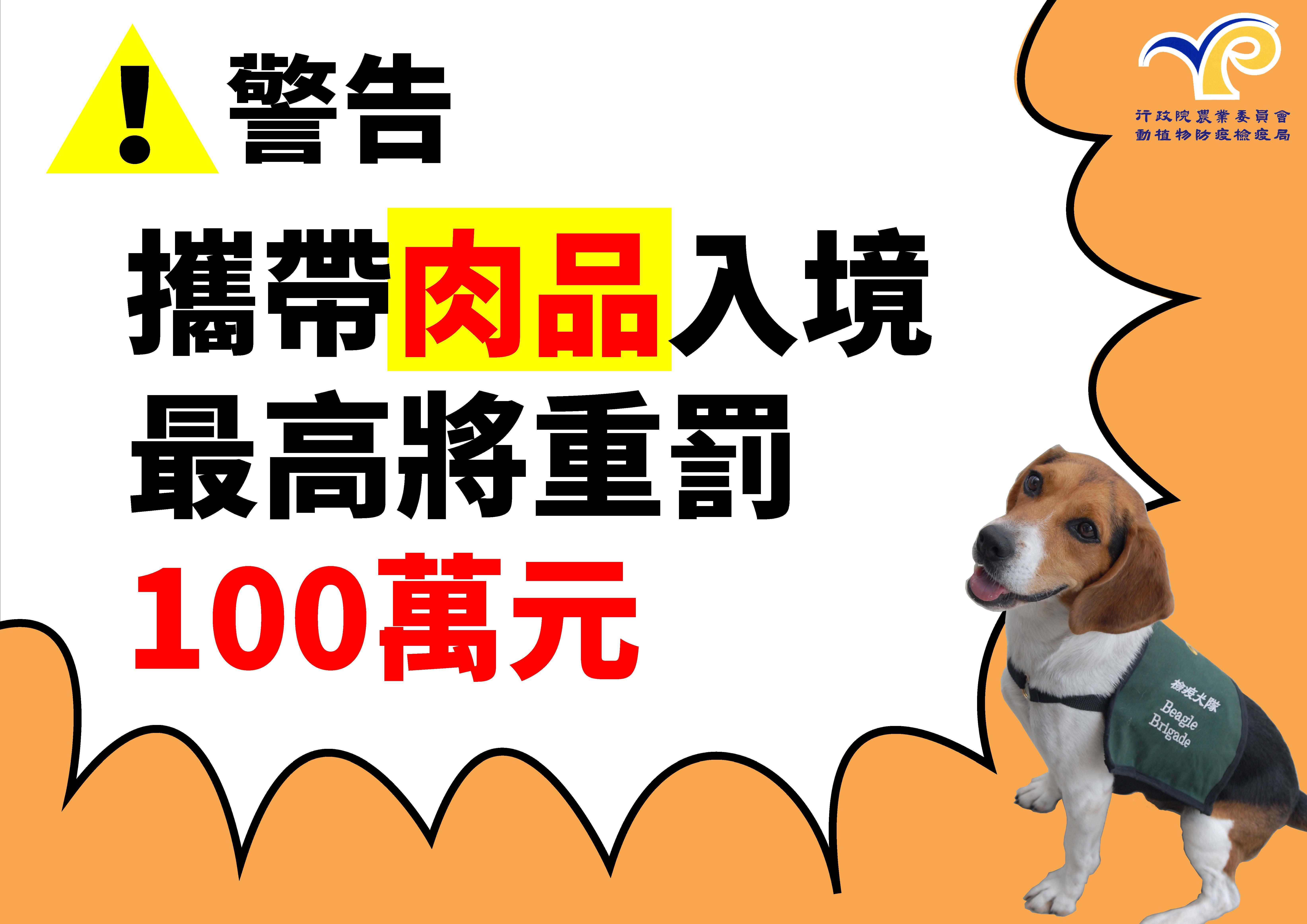為因應非洲豬瘟疫情持續擴散,維護我國農畜產業之安全,請來臺旅客切勿網購或攜帶非洲豬瘟疫區之家畜肉品或走私動物及其產品入境我國,違者最高可處新台幣100萬元罰鍰。