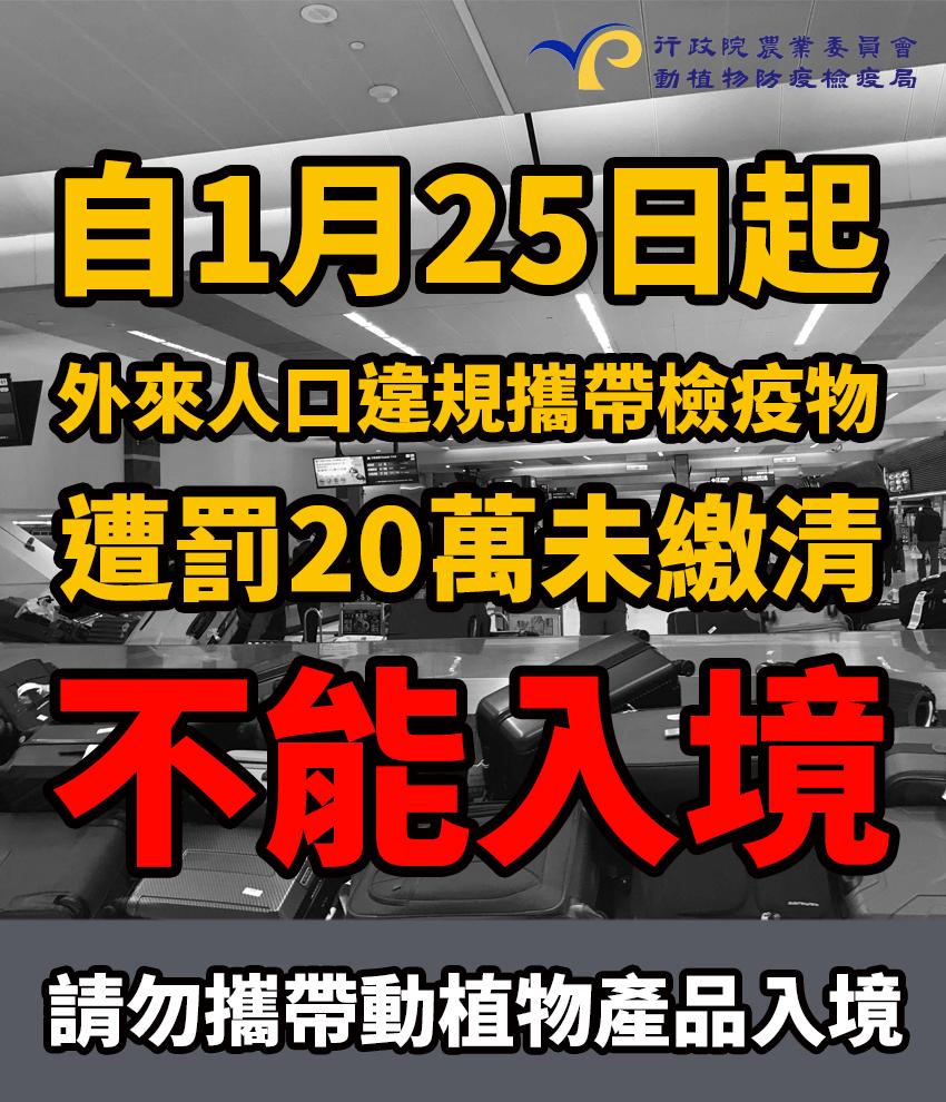自108年1月25日起,凡外來人口自過去3年來曾發生非洲豬瘟的國家(地區)違規攜帶豬肉類產品入境,經裁處20萬元(含以上)且無法當場繳清者,我國將拒絕其入境。