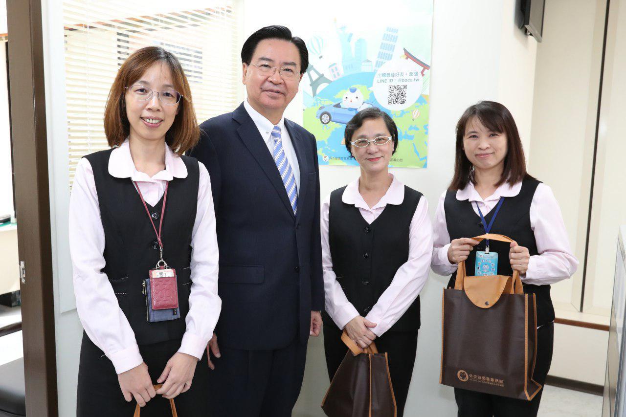 外交部長吳釗燮於本(108)年11月11日上午視察外交部領事事務局新增辦公空間,並頒獎表揚獲得民眾年度票選前三名的最佳領務櫃檯服務同仁。此外,吳部長也視察領務局新增辦公空間使用情形,為同仁加油打氣,勉勵同仁提供民眾優質的領事服務品質。吳部長並與領務局的吉祥物「魔法波鴿」合影留念。 吳部長向來極為關心外交部同仁的工作環境,瞭解領務局部份同仁因辦公空間不足,必需輪流共用一張辦公桌,也有部份同仁必需在走道上班。因此吳部長上任之初即為領務局的同仁爭取到中央聯合辦公大樓五樓的新增辦公空間,以改善同仁長期以來辦公環境擁擠及辦公空間不足的問題。 領務局是外交部為民服務的窗口,負責辦理護照、簽證、文件證明,並提供出國旅遊參考資訊及旅外國人急難救助相關服務,相關業務均攸關民眾的權益。領務局的Line帳號提供民眾各種詳細且實用的服務資訊,目前已有188萬人加入,為國人出國旅遊時提供多一分保障。(E)