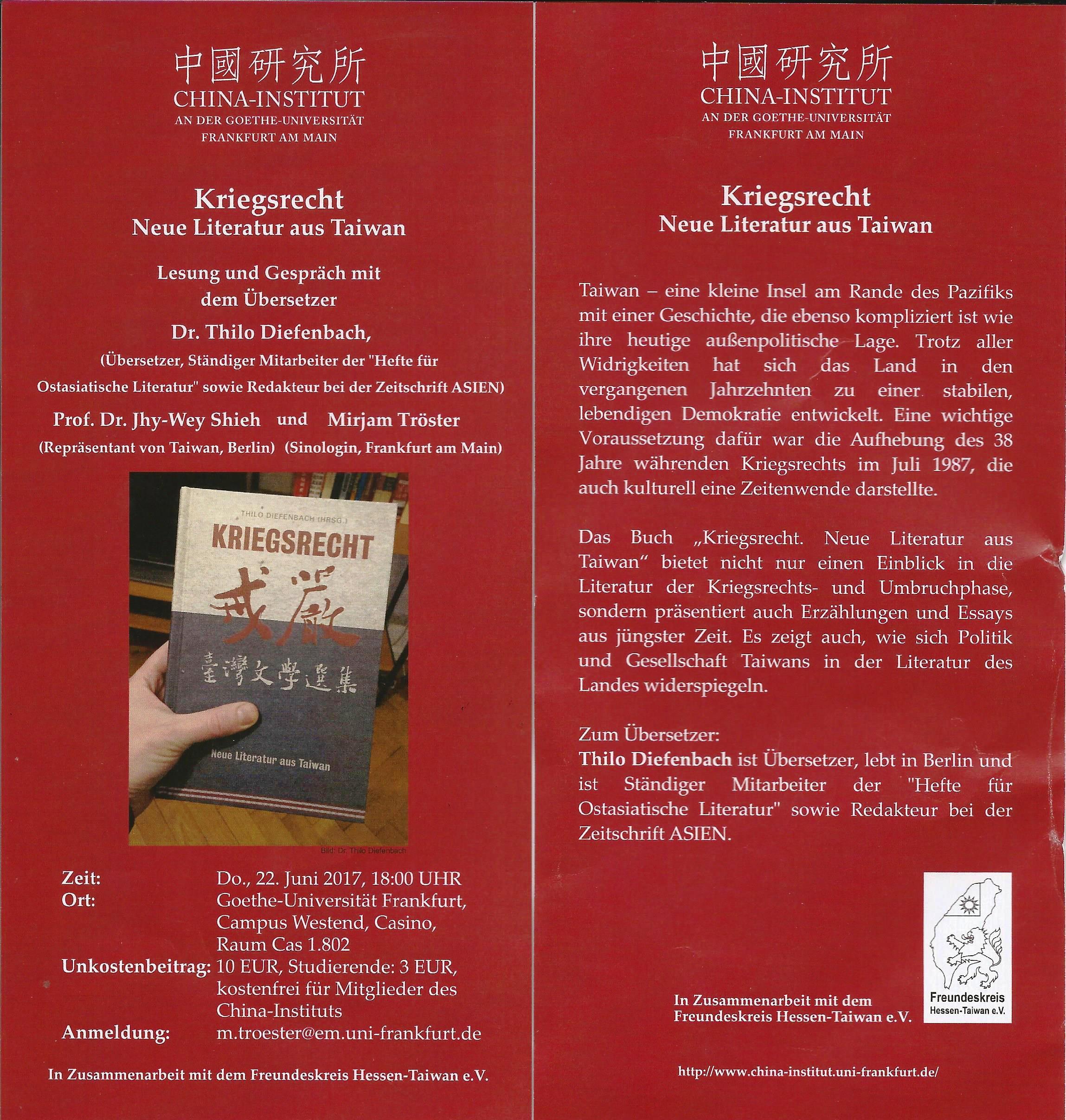 Veranstaltung: „Kriegsrecht. Neue Literatur au... - Taipeh Vertretung in der Bundesrepublik Deutschland, Büro Frankfurt am Main 駐德國台北代表處法蘭克福辦事處 :::