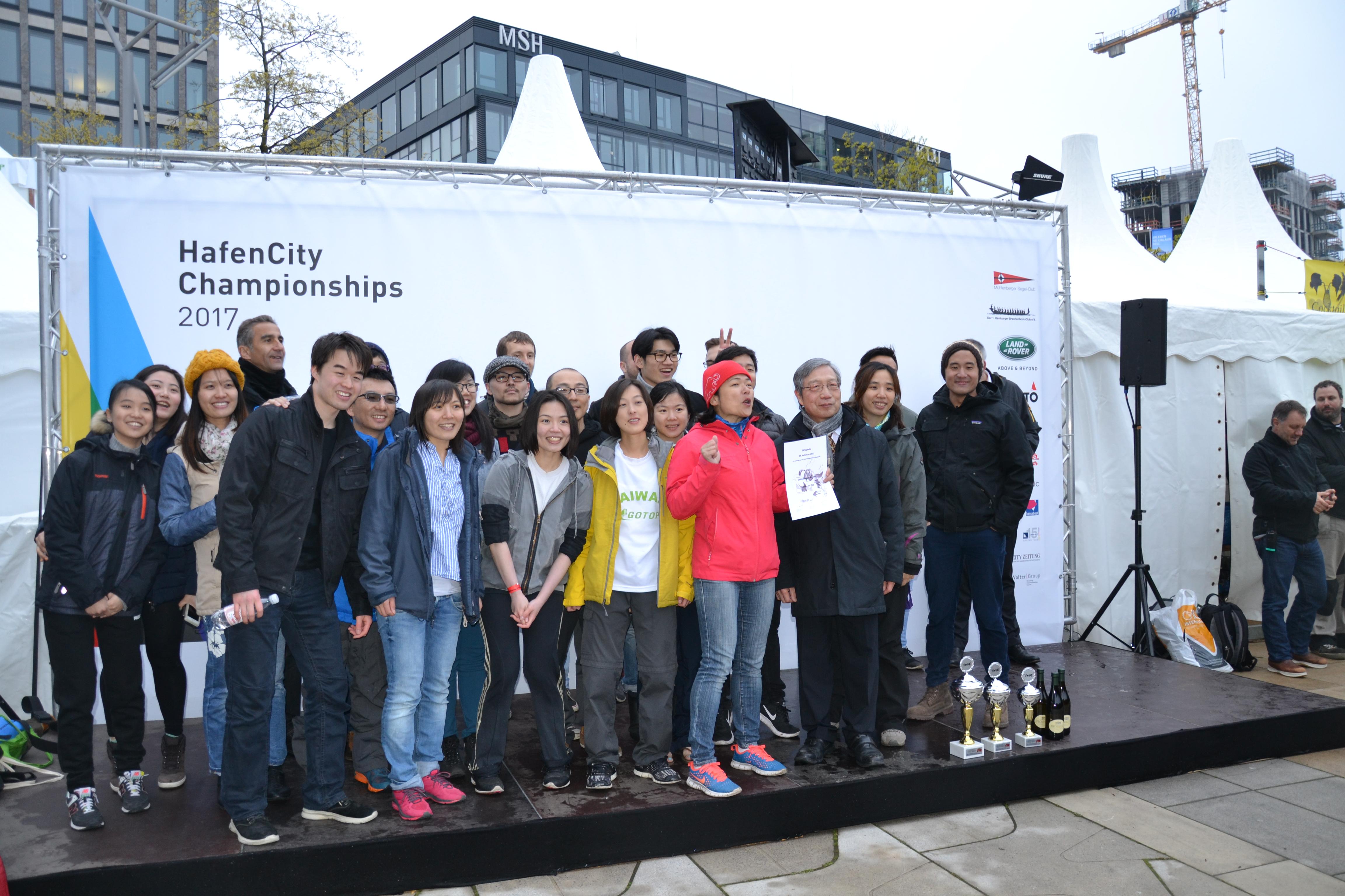 Der Generaldirektor der Taipeh Vertretung, Herr Jian-Song Chu, übernahm in diesem Jahr wieder die Schirmherrschaft zusammen mit dem Wirtschaftssenator. Er gab am Freitag das Start-Signal und verlieh im Anschluss die Pokale. Trotz der schwierigen Bedingungen – das Wetter war kalt und es herrschte Niedrigwasser – ließen sich die Teams nicht davon abhalten mit guter Laune ihr Bestes zu geben. Zum Schluss hat sich das Wolfsrudel der Hamburger Feuerwehr mit vollem Einsatz durch den Hafenschlick zum Sieg gepaddelt. Der Sieg war mehr als verdient, wie die tiefen Furchen auf dem Meeresboden deutlich zeigten. Auf einem beachtlichen 3. Platz landete in diesem Rennen das Team Hamburg Admirality gefolgt von unserem Team Taiwan GoTop unter Teamcaptain Yu-Fang Chien. Das strahlende Lächeln auf den Gesichtern der Teilnehmer ließ das schlechte Wetter und die Kälte schnell vergessen.
