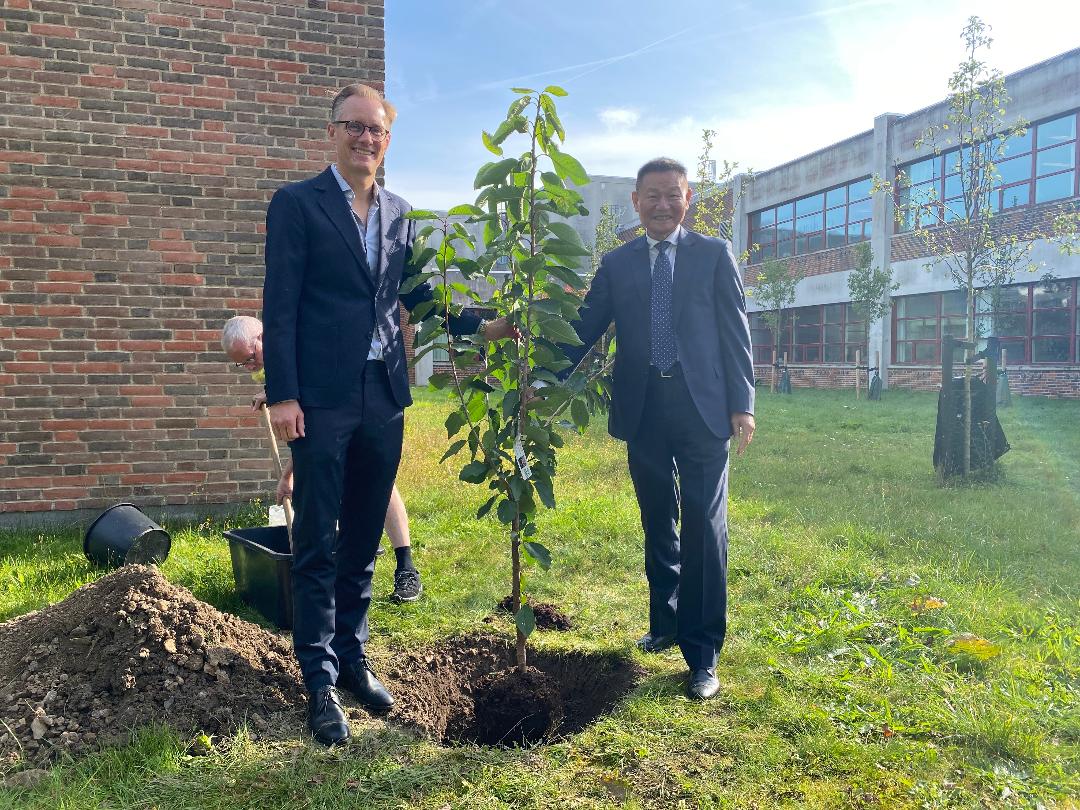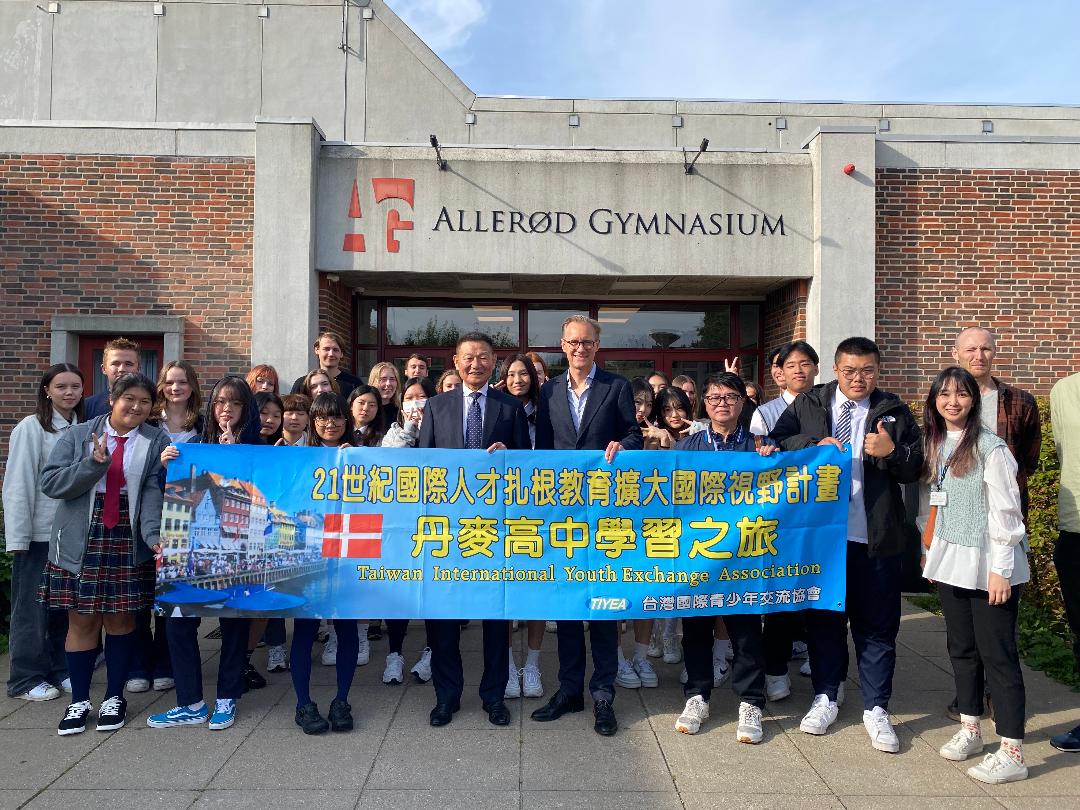 9月26日上午本處李大使前往Allerod高中探視前來丹麥交流的治平高中及內壢高中學生,鼓勵台丹校際交流持續蓬勃發展,並與Allerod高中校長共同植下一株櫻桃樹苗,象徵百年樹人之教育大業及台丹友誼長存。