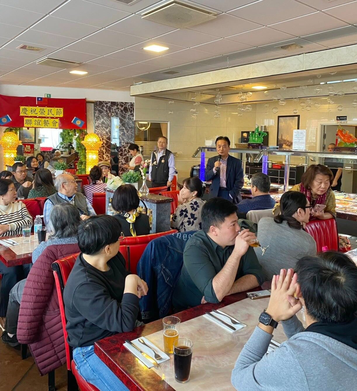 本處鄭大使榮俊夫婦偕同仁員眷應邀出席慶祝榮民節聯誼餐會,與丹麥榮光會成員等百餘名僑胞餐敘同樂。 榮光會江會長浩鈞首先致詞歡迎在場僑民蒞臨,表示歷來榮光會舉辦定期聚會活動宗旨即為協助退伍軍眷於海外團結一心,交換意見平台,亦樂見丹麥榮光會創立迄今,協助會員及僑胞踴躍相互交流。 鄭大使接續致詞表示,抵任迄今深刻感受丹麥僑社活力及團結,更感謝僑社在本處業務推動上之大力協助。 鄭大使亦感謝榮光會成員過去在國內擔任軍職期間保家衛國之付出,並請僑胞們能持續協助本處業務推動、時賜建言。 本次餐會氣氛熱烈溫馨,僑胞們在活動期間交流熱絡並分享各項生活資訊,賓主盡歡。