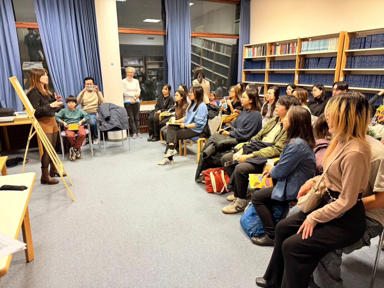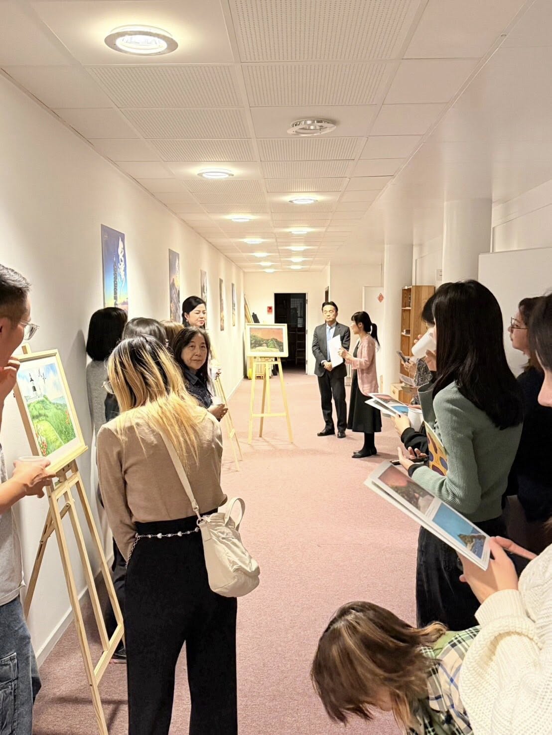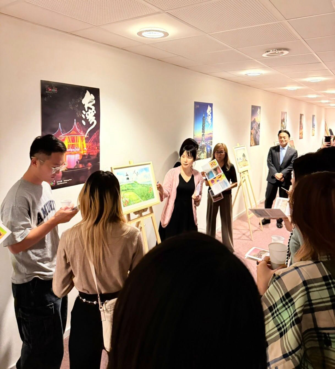 本處鄭大使夫婦於本(11)月7日於本處主持「2025歐洲台灣文化年」視覺藝術展計畫「海洋台灣:風景與繪畫」展覽開幕事,邀請旅丹僑胞及留學生等各界人士計約40人出席。本次本處獲外交部配發藝術畫作共6幅,包含觀音山、石門洞及野柳等北海岸山水名勝,未來也將於本處領務大廳公共空間展出,歡迎來處洽公的僑胞朋友一同欣賞。本次活動也特別邀請,亦擅於繪畫之本處張秘書峻偉眷屬謝函潔女士展示畫作並現身說法,藉由伊所創作、包含駐地等歐洲知名景點之素描與在場賓客交流創作心得及畫作解析。